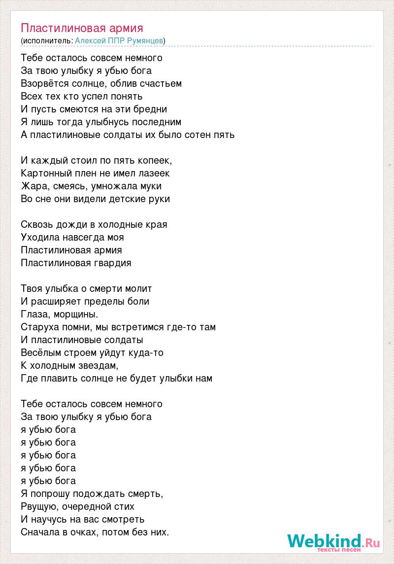 Тебе осталось совсем немного За твою улыбку я убью бога Взорвётся солнце, облив счастьем Всех тех кто успел понять И пусть смеются на эти бредни Я лишь тогда улыбнусь последним А пластилиновые солдаты их было сотен пять И каждый стоил по пять копеек, Картонный плен не имел лазеек Жара, смеясь, умножала муки Во сне они видели детские руки Сквозь дожди в холодные края Уходила навсегда моя Пластилиновая армия Пластилиновая гвардия Твоя улыбка о смерти молит И расширяет пределы боли Глаза, морщины. Старуха помни, мы встретимся где-то там И пластилиновые солдаты Весёлым строем уйдут куда-то К холодным звездам, Где плавить солнце не будет улыбки нам Тебе осталось совсем немного За твою улыбку я убью бога я убью бога я убью бога я убью бога я убью бога я убью бога Я попрошу подождать смерть, Рвущую, очередной стих И научусь на вас смотреть Сначала в очках, потом без них.