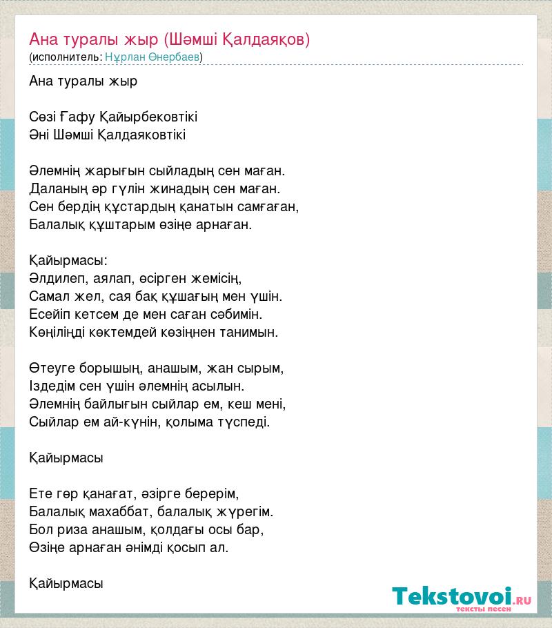 Ана туралы жыр Сөзі Ғафу Қайырбековтікі Әні Шәмші Қалдаяковтікі Әлемнің жарығын сыйладың сен маған. Даланың әр гүлін жинадың сен маған. Сен бердің құстардың қанатын самғаған, Балалық құштарым өзіңе арнаған. Қайырмасы: Әлдилеп, аялап, өсірген жемісің, Самал жел, сая бақ құшағың мен үшін. Есейіп кетсем де мен саған сәбимін. Көңіліңді көктемдей көзіңнен танимын. Өтеуге борышың, анашым, жан сырым, Іздедім сен үшін әлемнің асылын. Әлемнің байлығын сыйлар ем, кеш мені, Сыйлар ем ай-күнін, қолыма түспеді. Қайырмасы Ете гөр қанағат, әзірге берерім, Балалық махаббат, балалық жүрегім. Бол риза анашым, қолдағы осы бар, Өзіңе арнаған әнімді қосып ал. Қайырмасы