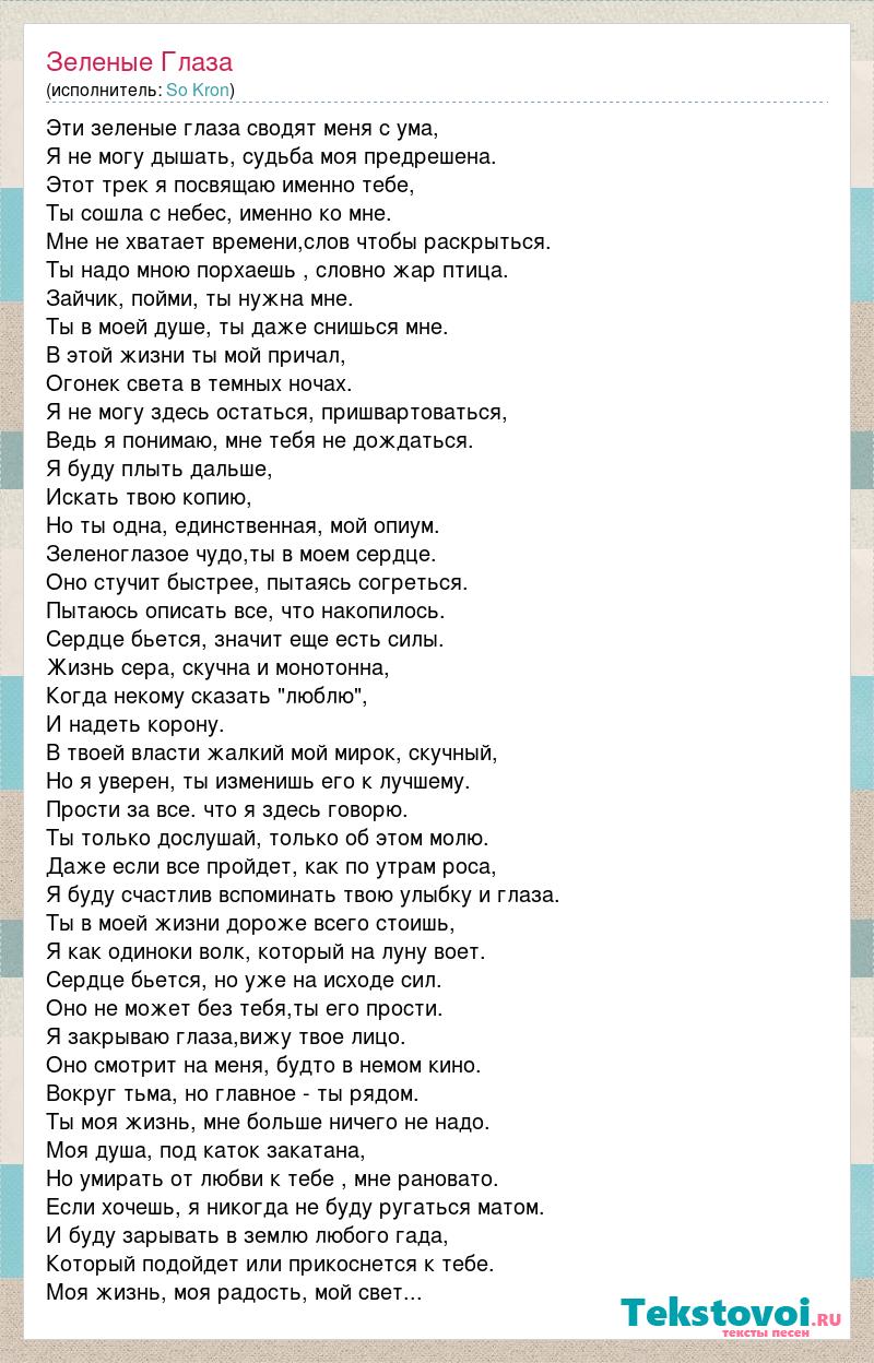 Эти зеленые глаза сводят меня с ума, Я не могу дышать, судьба моя предрешена. Этот трек я посвящаю именно тебе, Ты сошла с небес, именно ко мне. Мне не хватает времени,слов чтобы раскрыться. Ты надо мною порхаешь , словно жар птица. Зайчик, пойми, ты нужна мне. Ты в моей душе, ты даже снишься мне. В этой жизни ты мой причал, Огонек света в темных ночах. Я не могу здесь остаться, пришвартоваться, Ведь я понимаю, мне тебя не дождаться. Я буду плыть дальше, Искать твою копию, Но ты одна, единственная, мой опиум. Зеленоглазое чудо,ты в моем сердце. Оно стучит быстрее, пытаясь согреться. Пытаюсь описать все, что накопилось. Сердце бьется, значит еще есть силы. Жизнь сера, скучна и монотонна, Когда некому сказать "люблю", И надеть корону. В твоей власти жалкий мой мирок, скучный, Но я уверен, ты изменишь его к лучшему. Прости за все. что я здесь говорю. Ты только дослушай, только об этом молю. Даже если все пройдет, как по утрам роса, Я буду счастлив вспоминать твою улыбку и глаза. Ты в моей жизни дороже всего стоишь, Я как одиноки волк, который на луну воет. Сердце бьется, но уже на исходе сил. Оно не может без тебя,ты его прости. Я закрываю глаза,вижу твое лицо. Оно смотрит на меня, будто в немом кино. Вокруг тьма, но главное - ты рядом. Ты моя жизнь, мне больше ничего не надо. Моя душа, под каток закатана, Но умирать от любви к тебе , мне рановато. Если хочешь, я никогда не буду ругаться матом. И буду зарывать в землю любого гада, Который подойдет или прикоснется к тебе. Моя жизнь, моя радость, мой свет...