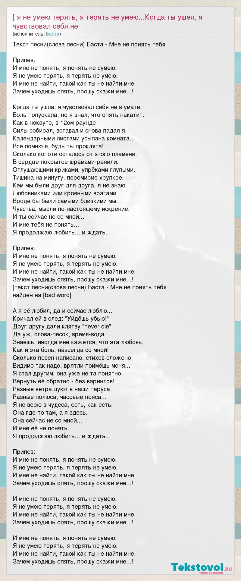 Текст песни(слова песни) Баста - Мне не понять тебя Припев: И мне не понять, я понять не сумею. Я не умею терять, я терять не умею. И мне не найти, такой как ты не найти мне. Зачем уходишь опять, прошу скажи мне...! Когда ты ушла, я чувствовал себя не в умате. Боль попускала, но я знал, что опять накатит. Как в нокауте, в 12ом раунде Силы собирал, вставал и снова падал я. Календарными листами усыпана комната... Всё помню я, будь ты проклята! Сколько копоти осталось от этого пламени. В сердце покрытое шрамами-ранили. Оглушающими криками, упрёками глупыми, Тишина на минуту, перемирие хрупкое. Кем мы были друг для друга, я не знаю. Любовниками или кровными врагами... Вроде бы были самыми близкими мы. Чувства, мысли по-настоящему искрение. И ты сейчас не со мной... И мне тебя не понять... Я продолжаю любить... и ждать... Припев: И мне не понять, я понять не сумею. Я не умею терять, я терять не умею. И мне не найти, такой как ты не найти мне. Зачем уходишь опять, прошу скажи мне...! [текст песни(слова песни) Баста - Мне не понять тебя найден на [bad word] А я её любил, да и сейчас люблю... Кричал ей в след: "Уйдёшь убью!" Друг другу дали клятву "never die" Да уж, слова-песок, время-вода... Знаешь, иногда мне кажется, что эта любовь, Как и эта боль, навсегда со мной! Сколько песен написано, стихов сложено Видимо так надо, врятли поймёшь меня... Я стал другим, она уже не та понятно Вернуть её обратно - без варинтов! Разные ветра дуют в наши паруса Разные полюса, часовые пояса... Я не верю в чудеса, есть, как есть. Она где-то там, а я здесь. Она сейчас не со мной... И мне её не понять... Я продолжаю любить... и ждать... Припев: И мне не понять, я понять не сумею. Я не умею терять, я терять не умею. И мне не найти, такой как ты не найти мне. Зачем уходишь опять, прошу скажи мне...! И мне не понять, я понять не сумею. Я не умею терять, я терять не умею. И мне не найти, такой как ты не найти мне. Зачем уходишь опять, прошу скажи мне...! И мне не понять, я понять не сумею. Я не умею терять, я терять не умею. И мне не найти, такой как ты не найти мне. Зачем уходишь опять, прошу скажи мне...!