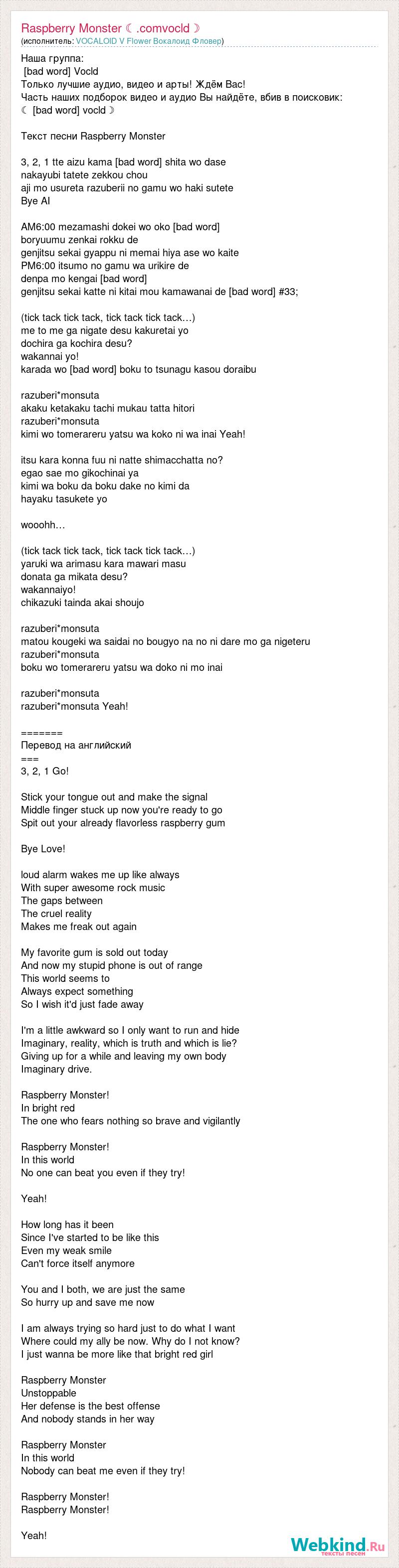 Наша группа: [bad word] Voсld Только лучшие аудио, видео и арты! Ждём Вас! Часть наших подборок видео и аудио Вы найдёте, вбив в поисковик: ☾ [bad word] voсld☽ Текст песни Raspberry Monster 3, 2, 1 tte aizu kama [bad word] shita wo dase nakayubi tatete zekkou chou aji mo usureta razuberii no gamu wo haki sutete Bye AI AM6:00 mezamashi dokei wo oko [bad word] boryuumu zenkai rokku de genjitsu sekai gyappu ni memai hiya ase wo kaite PM6:00 itsumo no gamu wa urikire de denpa mo kengai [bad word] genjitsu sekai katte ni kitai mou kamawanai de [bad word] #33; (tick tack tick tack, tick tack tick tack…) me to me ga nigate desu kakuretai yo dochira ga kochira desu? wakannai yo! karada wo [bad word] boku to tsunagu kasou doraibu razuberi*monsuta akaku ketakaku tachi mukau tatta hitori razuberi*monsuta kimi wo tomerareru yatsu wa koko ni wa inai Yeah! itsu kara konna fuu ni natte shimacchatta no? egao sae mo gikochinai ya kimi wa boku da boku dake no kimi da hayaku tasukete yo wooohh… (tick tack tick tack, tick tack tick tack…) yaruki wa arimasu kara mawari masu donata ga mikata desu? wakannaiyo! chikazuki tainda akai shoujo razuberi*monsuta matou kougeki wa saidai no bougyo na no ni dare mo ga nigeteru razuberi*monsuta boku wo tomerareru yatsu wa doko ni mo inai razuberi*monsuta razuberi*monsuta Yeah! ======= Перевод на английский === 3, 2, 1 Go! Stick your tongue out and make the signal Middle finger stuck up now you're ready to go Spit out your already flavorless raspberry gum Bye Love! loud alarm wakes me up like always With super awesome rock music The gaps between The cruel reality Makes me freak out again My favorite gum is sold out today And now my stupid phone is out of range This world seems to Always expect something So I wish it'd just fade away I'm a little awkward so I only want to run and hide Imaginary, reality, which is truth and which is lie? Giving up for a while and leaving my own body Imaginary drive. Raspberry Monster! In bright red The one who fears nothing so brave and vigilantly Raspberry Monster! In this world No one can beat you even if they try! Yeah! How long has it been Since I've started to be like this Even my weak smile Can't force itself anymore You and I both, we are just the same So hurry up and save me now I am always trying so hard just to do what I want Where could my ally be now. Why do I not know? I just wanna be more like that bright red girl Raspberry Monster Unstoppable Her defense is the best offense And nobody stands in her way Raspberry Monster In this world Nobody can beat me even if they try! Raspberry Monster! Raspberry Monster! Yeah!