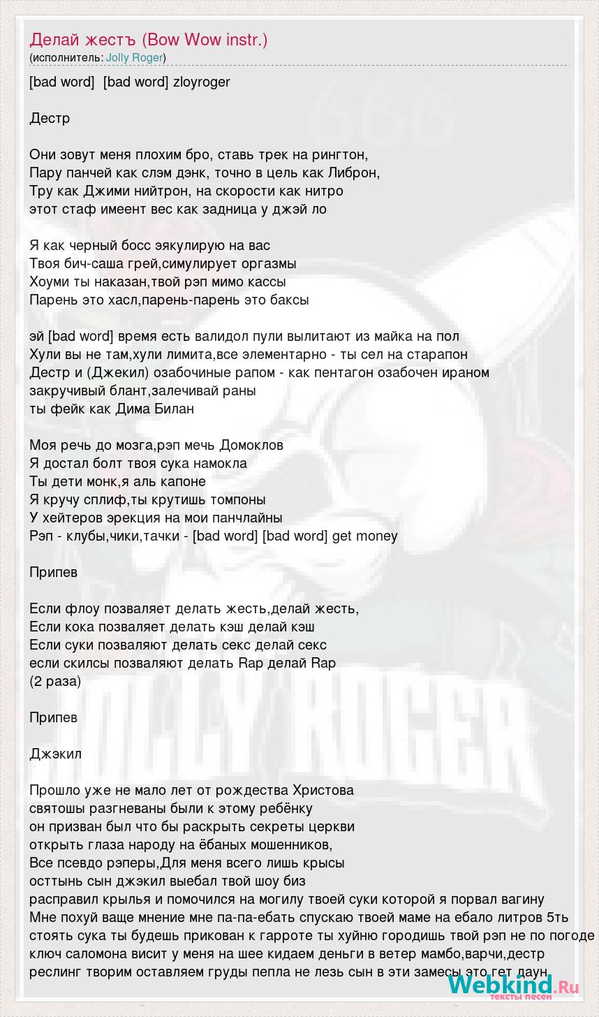 [bad word] [bad word] zloyroger Дестр Они зовут меня плохим бро, ставь трек на рингтон, Пару панчей как слэм дэнк, точно в цель как Либрон, Тру как Джими нийтрон, на скорости как нитро этот стаф имеент вес как задница у джэй ло Я как черный босс эякулирую на вас Твоя бич-саша грей,симулирует оргазмы Хоуми ты наказан,твой рэп мимо кассы Парень это хасл,парень-парень это баксы эй [bad word] время есть валидол пули вылитают из майка на пол Хули вы не там,хули лимита,все элементарно - ты сел на старапон Дестр и (Джекил) озабочиные рапом - как пентагон озабочен ираном закручивый блант,залечивай раны ты фейк как Дима Билан Моя речь до мозга,рэп мечь Домоклов Я достал болт твоя сука намокла Ты дети монк,я аль капоне Я кручу сплиф,ты крутишь томпоны У хейтеров эрекция на мои панчлайны Рэп - клубы,чики,тачки - [bad word] [bad word] get money Припев Если флоу позваляет делать жесть,делай жесть, Если кока позваляет делать кэш делай кэш Если суки позваляют делать секс делай секс если скилсы позваляют делать Rap делай Rap (2 раза) Припев Джэкил Прошло уже не мало лет от рождества Христова святошы разгневаны были к этому ребёнку он призван был что бы раскрыть секреты церкви открыть глаза народу на ёбаных мошенников, Все псевдо рэперы,Для меня всего лишь крысы осттынь сын джэкил выебал твой шоу биз расправил крылья и помочился на могилу твоей суки которой я порвал вагину Мне похуй ваще мнение мне па-па-ебать спускаю твоей маме на ебало литров 5ть стоять сука ты будешь прикован к гарроте ты хуйню городишь твой рэп не по погоде ключ саломона висит у меня на шее кидаем деньги в ветер мамбо,варчи,дестр реслинг творим оставляем груды пепла не лезь сын в эти замесы это гет даун
