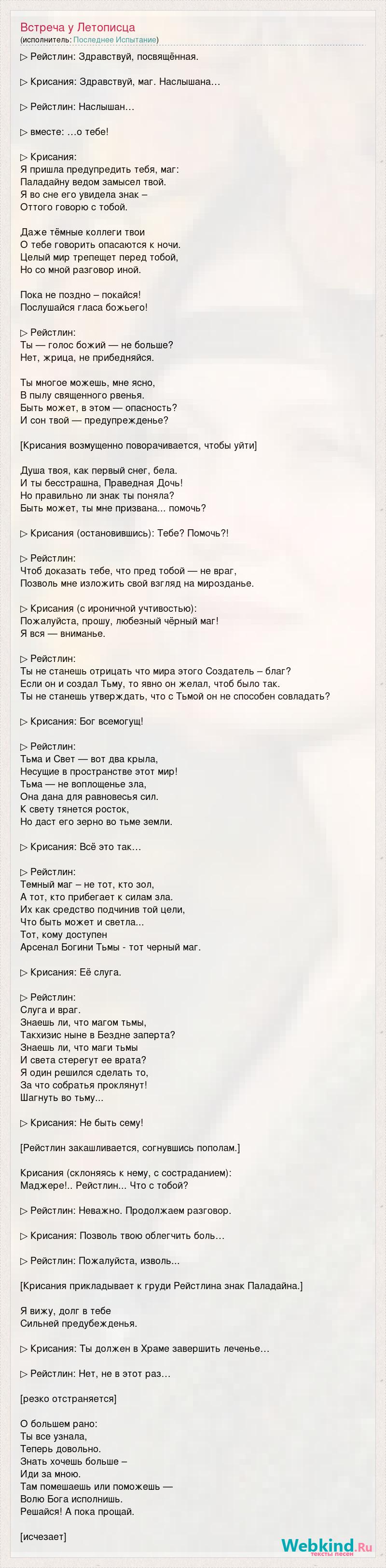 ▷ Рейстлин: Здравствуй, посвящённая. ▷ Крисания: Здравствуй, маг. Наслышана… ▷ Рейстлин: Наслышан… ▷ вместе: …о тебе! ▷ Крисания: Я пришла предупредить тебя, маг: Паладайну ведом замысел твой. Я во сне его увидела знак – Оттого говорю с тобой. Даже тёмные коллеги твои О тебе говорить опасаются к ночи. Целый мир трепещет перед тобой, Но со мной разговор иной. Пока не поздно – покайся! Послушайся гласа божьего! ▷ Рейстлин: Ты — голос божий — не больше? Нет, жрица, не прибедняйся. Ты многое можешь, мне ясно, В пылу священного рвенья. Быть может, в этом — опасность? И сон твой — предупрежденье? [Крисания возмущенно поворачивается, чтобы уйти] Душа твоя, как первый снег, бела. И ты бесстрашна, Праведная Дочь! Но правильно ли знак ты поняла? Быть может, ты мне призвана... помочь? ▷ Крисания (остановившись): Тебе? Помочь?! ▷ Рейстлин: Чтоб доказать тебе, что пред тобой — не враг, Позволь мне изложить свой взгляд на мирозданье. ▷ Крисания (с ироничной учтивостью): Пожалуйста, прошу, любезный чёрный маг! Я вся — вниманье. ▷ Рейстлин: Ты не станешь отрицать что мира этого Создатель – благ? Если он и создал Тьму, то явно он желал, чтоб было так. Ты не станешь утверждать, что с Тьмой он не способен совладать? ▷ Крисания: Бог всемогущ! ▷ Рейстлин: Тьма и Свет — вот два крыла, Несущие в пространстве этот мир! Тьма — не воплощенье зла, Она дана для равновесья сил. К свету тянется росток, Но даст его зерно во тьме земли. ▷ Крисания: Всё это так… ▷ Рейстлин: Темный маг – не тот, кто зол, А тот, кто прибегает к силам зла. Их как средство подчинив той цели, Что быть может и светла... Тот, кому доступен Арсенал Богини Тьмы - тот черный маг. ▷ Крисания: Её слуга. ▷ Рейстлин: Слуга и враг. Знаешь ли, что магом тьмы, Такхизис ныне в Бездне заперта? Знаешь ли, что маги тьмы И света стерегут ее врата? Я один решился сделать то, За что собратья проклянут! Шагнуть во тьму... ▷ Крисания: Не быть сему! [Рейстлин закашливается, согнувшись пополам.] Крисания (склоняясь к нему, с состраданием): Маджере!.. Рейстлин... Что с тобой? ▷ Рейстлин: Неважно. Продолжаем разговор. ▷ Крисания: Позволь твою облегчить боль… ▷ Рейстлин: Пожалуйста, изволь... [Крисания прикладывает к груди Рейстлина знак Паладайна.] Я вижу, долг в тебе Сильней предубежденья. ▷ Крисания: Ты должен в Храме завершить леченье… ▷ Рейстлин: Нет, не в этот раз… [резко отстраняется] О большем рано: Ты все узнала, Теперь довольно. Знать хочешь больше – Иди за мною. Там помешаешь или поможешь — Волю Бога исполнишь. Решайся! А пока прощай. [исчезает]