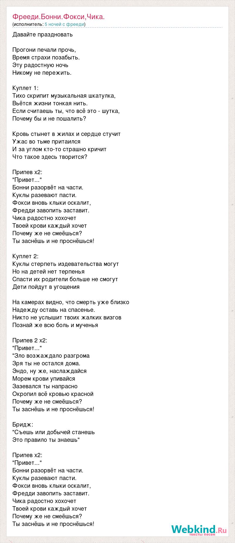 Давайте праздновать Прогони печали прочь, Время страхи позабыть. Эту радостную ночь Никому не пережить. Куплет 1: Тихо скрипит музыкальная шкатулка, Вьётся жизни тонкая нить. Если считаешь ты, что всё это - шутка, Почему бы и не пошалить? Кровь стынет в жилах и сердце стучит Ужас во тьме притаился И за углом кто-то страшно кричит Что такое здесь творится? Припев x2: "Привет..." Бонни разорвёт на части. Куклы разевают пасти. Фокси вновь клыки оскалит, Фредди завопить заставит. Чика радостно хохочет Твоей крови каждый хочет Почему же не смеёшься? Ты заснёшь и не проснёшься! Куплет 2: Куклы стерпеть издевательства могут Но на детей нет терпенья Спасти их родители больше не смогут Дети пойдут в угощения На камерах видно, что смерть уже близко Надежду оставь на спасенье. Никто не услышит твоих жалких визгов Познай же всю боль и мученья Припев 2 x2: "Привет..." "Зло возжаждало разгрома Зря ты не остался дома. Эндо, ну же, наслаждайся Морем крови упивайся Зазевался ты напрасно Окропил всё кровью красной Почему же не смеёшься? Ты заснёшь и не проснёшься! Бридж: "Съешь или добычей станешь Это правило ты знаешь" Припев x2: "Привет..." Бонни разорвёт на части. Куклы разевают пасти. Фокси вновь клыки оскалит, Фредди завопить заставит. Чика радостно хохочет Твоей крови каждый хочет Почему же не смеёшься? Ты заснёшь и не проснёшься!