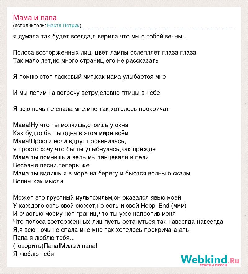я думала так будет всегда,я верила что мы с тобой вечны... Полоса восторженных лиц, цвет лампы ослепляет глаза глаза. Так мало лет,но много страниц его не рассказать Я помню этот ласковый миг,как мама улыбается мне И мы летим на встречу ветру,словно птицы в небе Я всю ночь не спала мне,мне так хотелось прокричат Мама!Ну что ты молчишь,стоишь у окна Как будто бы ты одна в этом мире всём Мама!Прости если вдруг провинилась, я просто хочу,что бы ты улыбнулась,как прежде Мама ты помнишь,а ведь мы танцевали и пели Весёлые песни,теперь же Мама ты видишь я в море на берегу и бьются волны о скалы Волны как мысли. Может это грустный мультфильм,он оказался явью моей У каждого есть свой сюжет,но есть и свой Heppi End (ммм) И счастью моему нет границ,что ты уже напротив меня Что полоса восторженных лиц пусть остануться так навсегда-навсегда Я,я всю ночь не спала мне,мне так хотелось прокрича-а-ать Папа я люблю тебя... (говорить)Папа!Милый папа! Я люблю тебя