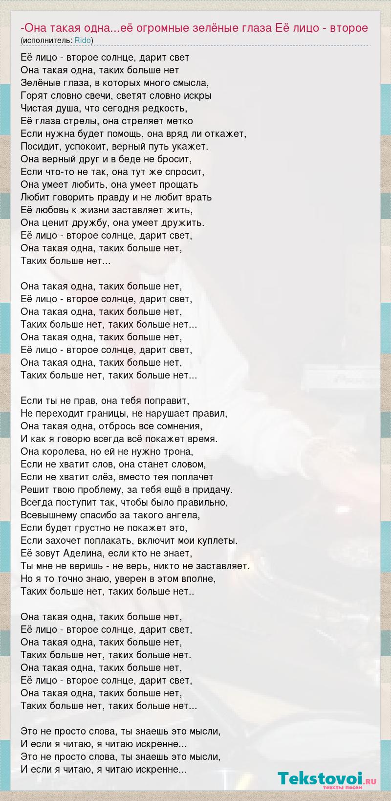 Её лицо - второе солнце, дарит свет Она такая одна, таких больше нет Зелёные глаза, в которых много смысла, Горят словно свечи, светят словно искры Чистая душа, что сегодня редкость, Её глаза стрелы, она стреляет метко Если нужна будет помощь, она вряд ли откажет, Посидит, успокоит, верный путь укажет. Она верный друг и в беде не бросит, Если что-то не так, она тут же спросит, Она умеет любить, она умеет прощать Любит говорить правду и не любит врать Её любовь к жизни заставляет жить, Она ценит дружбу, она умеет дружить. Её лицо - второе солнце, дарит свет, Она такая одна, таких больше нет, Таких больше нет... Она такая одна, таких больше нет, Её лицо - второе солнце, дарит свет, Она такая одна, таких больше нет, Таких больше нет, таких больше нет... Она такая одна, таких больше нет, Её лицо - второе солнце, дарит свет, Она такая одна, таких больше нет, Таких больше нет, таких больше нет... Если ты не прав, она тебя поправит, Не переходит границы, не нарушает правил, Она такая одна, отбрось все сомнения, И как я говорю всегда всё покажет время. Она королева, но ей не нужно трона, Если не хватит слов, она станет словом, Если не хватит слёз, вместо тея поплачет Решит твою проблему, за тебя ещё в придачу. Всегда поступит так, чтобы было правильно, Всевышнему спасибо за такого ангела, Если будет грустно не покажет это, Если захочет поплакать, включит мои куплеты. Её зовут Аделина, если кто не знает, Ты мне не веришь - не верь, никто не заставляет. Но я то точно знаю, уверен в этом вполне, Таких больше нет, таких больше нет.. Она такая одна, таких больше нет, Её лицо - второе солнце, дарит свет, Она такая одна, таких больше нет, Таких больше нет, таких больше нет. Она такая одна, таких больше нет, Её лицо - второе солнце, дарит свет, Она такая одна, таких больше нет, Таких больше нет, таких больше нет... Это не просто слова, ты знаешь это мысли, И если я читаю, я читаю искренне... Это не просто слова, ты знаешь это мысли, И если я читаю, я читаю искренне...