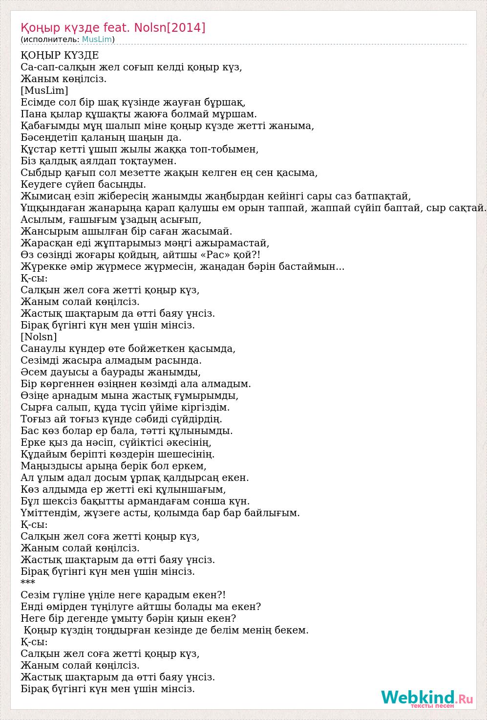 ҚОҢЫР КҮЗДЕ Са-сап-салқын жел соғып келді қоңыр күз, Жаным көңілсіз. [MusLim] Есімде сол бір шақ күзінде жауған бұршақ, Пана қылар құшақты жаюға болмай мұршам. Қабағымды мұң шалып міне қоңыр күзде жетті жаныма, Бәсеңдетіп қаланың шаңын да. Құстар кетті ұшып жылы жаққа топ-тобымен, Біз қалдық аялдап тоқтаумен. Сыбдыр қағып сол мезетте жақын келген ең сен қасыма, Кеудеге сүйеп басыңды. Жымисаң езіп жібересің жанымды жаңбырдан кейінгі сары саз батпақтай, Ұщқындаған жанарыңа қарап қалушы ем орын таппай, жаппай сүйіп баптай, сыр сақтай. Асылым, ғашығым ұзадың асығып, Жансырым ашылған бір саған жасымай. Жарасқан еді жұптарымыз мәңгі ажырамастай, Өз сөзіңді жоғары қойдың, айтшы «Рас» қой?! Жүрекке әмір жүрмесе жүрмесін, жаңадан бәрін бастаймын... Қ-сы: Салқын жел соға жетті қоңыр күз, Жаным солай көңілсіз. Жастық шақтарым да өтті баяу үнсіз. Бірақ бүгінгі күн мен үшін мінсіз. [Nolsn] Санаулы күндер өте бойжеткен қасымда, Сезімді жасыра алмадым расында. Әсем дауысы а баурады жанымды, Бір көргеннен өзіңнен көзімді ала алмадым. Өзіңе арнадым мына жастық ғұмырымды, Сырға салып, құда түсіп үйіме кіргіздім. Тоғыз ай тоғыз күнде сәбиді сүйдірдің. Бас көз болар ер бала, тәтті құлынымды. Ерке қыз да нәсіп, сүйіктісі әкесінің, Құдайым беріпті көздерін шешесінің. Маңыздысы арыңа берік бол еркем, Ал ұлым адал досым ұрпақ қалдырсаң екен. Көз алдымда ер жетті екі құлыншағым, Бұл шексіз бақытты армандағам сонша күн. Үміттендім, жүзеге асты, қолымда бар бар байлығым. Қ-сы: Салқын жел соға жетті қоңыр күз, Жаным солай көңілсіз. Жастық шақтарым да өтті баяу үнсіз. Бірақ бүгінгі күн мен үшін мінсіз. *** Сезім гүліне үңіле неге қарадым екен?! Енді өмірден түңілуге айтшы болады ма екен? Неге бір дегенде ұмыту бәрін қиын екен? Қоңыр күздің тоңдырған кезінде де белім менің бекем. Қ-сы: Салқын жел соға жетті қоңыр күз, Жаным солай көңілсіз. Жастық шақтарым да өтті баяу үнсіз. Бірақ бүгінгі күн мен үшін мінсіз.