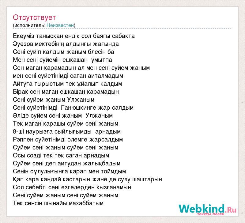 Екеуміз таныскан ендік сол баягы сабакта Әуезов мектебінің алдынғы жағында Сені суйіп калдым жаным блесін ба Мен сені суйемін ешкашан умытпа Сен маган карамадын ал мен сені суйем жаным мен сені суйетінімді саган аиталмадым Айтуға тырыстым тек ұйалып калдым Бірак сен маган ешкашан карамадын Сені суйем жаным Улжаным Сені суйетінімді Ганюшкинге жар салдым Әліде суйем сені жаным Улжаным Тек маган карашы суйем сені жаным 8-ші наурызға сыйлығымды арнадым Рэппен суйетінімді әлемге жарсалдым Суйем сені жаным суйем сені жаным Осы созді тек тек саган арнадым Суйем сені деп аитудан жалықбадым Сенін сұлулығынға карап мен тоймдым Қап кара кандай кастарын жане де сулу шаштарын Сол себебті сені өзгелерден кызғанамын Сені суйем жаным сені суйем жаным Тек сенсін шынайы махаббатым