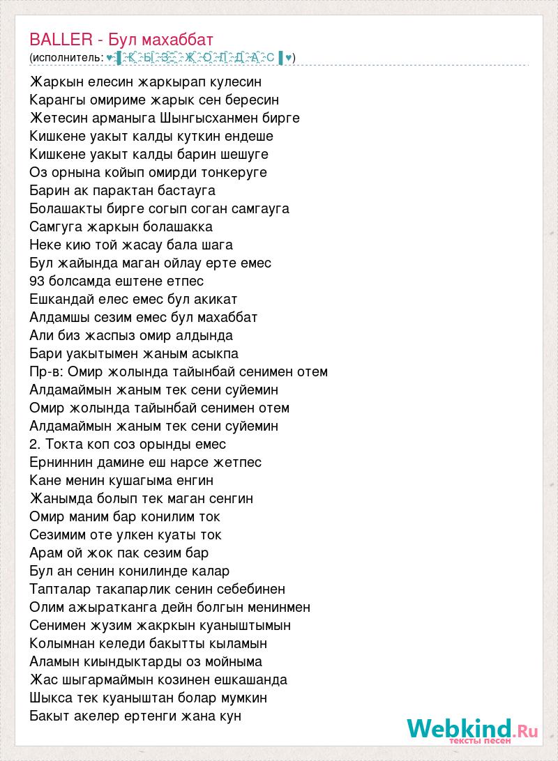 Жаркын елесин жаркырап кулесин Карангы омириме жарык сен бересин Жетесин арманыга Шынгысханмен бирге Кишкене уакыт калды куткин ендеше Кишкене уакыт калды барин шешуге Оз орнына койып омирди тонкеруге Барин ак парактан бастауга Болашакты бирге согып соган самгауга Самгуга жаркын болашакка Неке кию той жасау бала шага Бул жайында маган ойлау ерте емес 93 болсамда ештене етпес Ешкандай елес емес бул акикат Алдамшы сезим емес бул махаббат Али биз жаспыз омир алдында Бари уакытымен жаным асыкпа Пр-в: Омир жолында тайынбай сенимен отем Алдамаймын жаным тек сени суйемин Омир жолында тайынбай сенимен отем Алдамаймын жаным тек сени суйемин 2. Токта коп соз орынды емес Ерниннин дамине еш нарсе жетпес Кане менин кушагыма енгин Жанымда болып тек маган сенгин Омир маним бар конилим ток Сезимим оте улкен куаты ток Арам ой жок пак сезим бар Бул ан сенин конилинде калар Тапталар такапарлик сенин себебинен Олим ажыратканга дейн болгын менинмен Сенимен жузим жакркын куаныштымын Колымнан келеди бакытты кыламын Аламын киындыктарды оз мойныма Жас шыгармаймын козинен ешкашанда Шыкса тек куаныштан болар мумкин Бакыт акелер ертенги жана кун