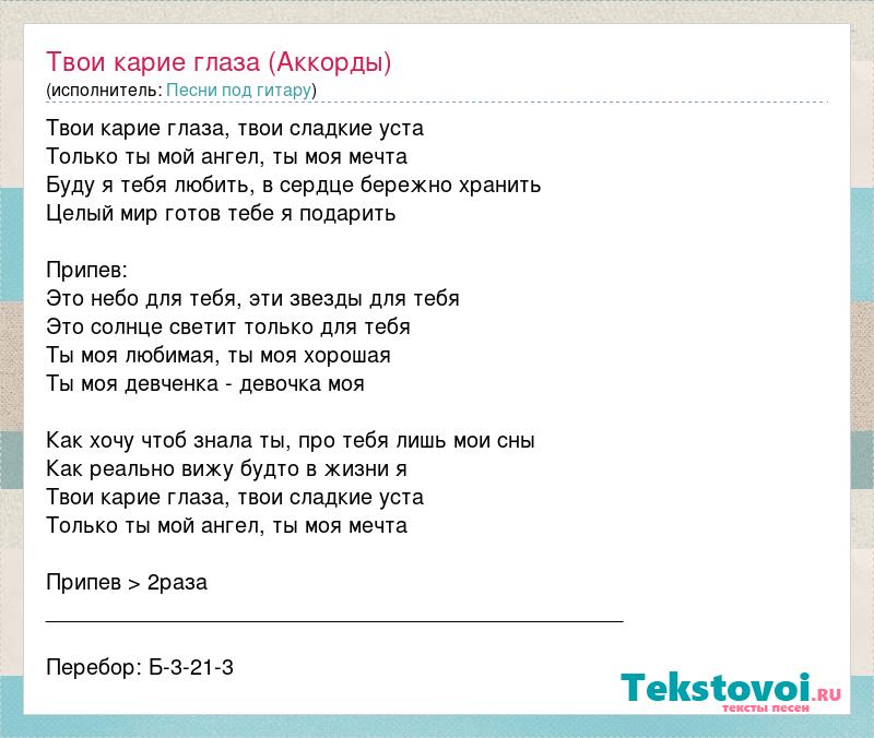 Твои карие глаза, твои сладкие уста Только ты мой ангел, ты моя мечта Буду я тебя любить, в сердце бережно хранить Целый мир готов тебе я подарить Припев: Это небо для тебя, эти звезды для тебя Это солнце светит только для тебя Ты моя любимая, ты моя хорошая Ты моя девченка - девочка моя Как хочу чтоб знала ты, про тебя лишь мои сны Как реально вижу будто в жизни я Твои карие глаза, твои сладкие уста Только ты мой ангел, ты моя мечта Припев > 2раза ________________________________________________ Перебор: Б-3-21-3