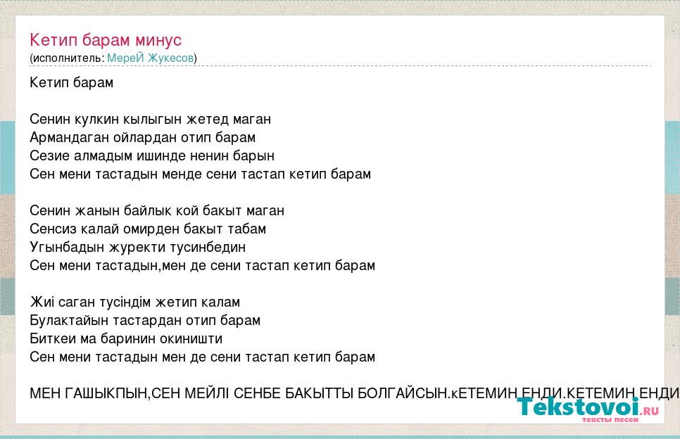 Кетип барам Сенин кулкин кылыгын жетед маган Армандаган ойлардан отип барам Сезие алмадым ишинде ненин барын Сен мени тастадын менде сени тастап кетип барам Сенин жанын байлык кой бакыт маган Сенсиз калай омирден бакыт табам Угынбадын журекти тусинбедин Сен мени тастадын,мен де сени тастап кетип барам Жиі саган тусіндім жетип калам Булактайын тастардан отип барам Биткеи ма баринин окиништи Сен мени тастадын мен де сени тастап кетип барам МЕН ГАШЫКПЫН,СЕН МЕЙЛІ СЕНБЕ БАКЫТТЫ БОЛГАЙСЫН.кЕТЕМИН ЕНДИ.КЕТЕМИН ЕНДИ
