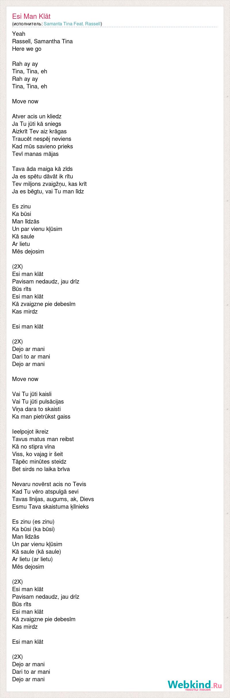 Yeah Rassell, Samantha Tina Here we go Rah ay ay Tina, Tina, eh Rah ay ay Tina, Tina, eh Move now Atver acis un kliedz Ja Tu jūti kā sniegs Aizkrīt Tev aiz krāgas Traucēt nespēj neviens Kad mūs savieno prieks Tevī manas mājas Tava āda maiga kā zīds Ja es spētu dāvāt ik rītu Tev miljons zvaigžņu, kas krīt Ja es bēgtu, vai Tu man līdz Es zinu Ka būsi Man līdzās Un par vienu kļūsim Kā saule Ar lietu Mēs dejosim (2X) Esi man klāt Pavisam nedaudz, jau drīz Būs rīts Esi man klāt Kā zvaigzne pie debesīm Kas mirdz Esi man klāt (2X) Dejo ar mani Dari to ar mani Dejo ar mani Move now Vai Tu jūti kaisli Vai Tu jūti pulsācijas Viņa dara to skaisti Ka man pietrūkst gaiss Ieelpojot ikreiz Tavus matus man reibst Kā no stipra vīna Viss, ko vajag ir šeit Tāpēc minūtes steidz Bet sirds no laika brīva Nevaru novērst acis no Tevis Kad Tu vēro atspulgā sevi Tavas līnijas, augums, ak, Dievs Esmu Tava skaistuma ķīlnieks Es zinu (es zinu) Ka būsi (ka būsi) Man līdzās Un par vienu kļūsim Kā saule (kā saule) Ar lietu (ar lietu) Mēs dejosim (2X) Esi man klāt Pavisam nedaudz, jau drīz Būs rīts Esi man klāt Kā zvaigzne pie debesīm Kas mirdz Esi man klāt (2X) Dejo ar mani Dari to ar mani Dejo ar mani