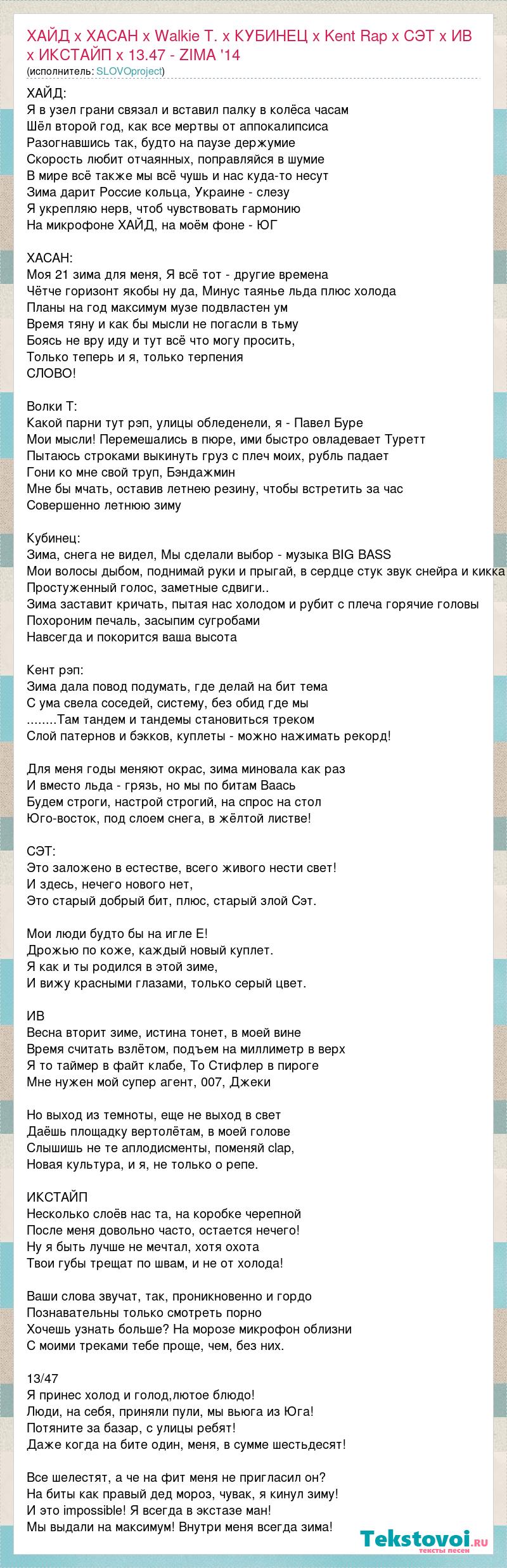 ХАЙД: Я в узел грани связал и вставил палку в колёса часам Шёл второй год, как все мертвы от аппокалипсиса Разогнавшись так, будто на паузе держумие Скорость любит отчаянных, поправляйся в шумие В мире всё также мы всё чушь и нас куда-то несут Зима дарит Россие кольца, Украине - слезу Я укрепляю нерв, чтоб чувствовать гармонию На микрофоне ХАЙД, на моём фоне - ЮГ ХАСАН: Моя 21 зима для меня, Я всё тот - другие времена Чётче горизонт якобы ну да, Минус таянье льда плюс холода Планы на год максимум музе подвластен ум Время тяну и как бы мысли не погасли в тьму Боясь не вру иду и тут всё что могу просить, Только теперь и я, только терпения СЛОВО! Волки Т: Какой парни тут рэп, улицы обледенели, я - Павел Буре Мои мысли! Перемешались в пюре, ими быстро овладевает Туретт Пытаюсь строками выкинуть груз с плеч моих, рубль падает Гони ко мне свой труп, Бэндажмин Мне бы мчать, оставив летнею резину, чтобы встретить за час Совершенно летнюю зиму Кубинец: Зима, снега не видел, Мы сделали выбор - музыка BIG BASS Мои волосы дыбом, поднимай руки и прыгай, в сердце стук звук снейра и кикка Простуженный голос, заметные сдвиги.. Зима заставит кричать, пытая нас холодом и рубит с плеча горячие головы Похороним печаль, засыпим сугробами Навсегда и покорится ваша высота Кент рэп: Зима дала повод подумать, где делай на бит тема С ума свела соседей, систему, без обид где мы ........Там тандем и тандемы становиться треком Слой патернов и бэкков, куплеты - можно нажимать рекорд! Для меня годы меняют окрас, зима миновала как раз И вместо льда - грязь, но мы по битам Ваась Будем строги, настрой строгий, на спрос на стол Юго-восток, под слоем снега, в жёлтой листве! СЭТ: Это заложено в естестве, всего живого нести свет! И здесь, нечего нового нет, Это старый добрый бит, плюс, старый злой Сэт. Мои люди будто бы на игле Е! Дрожью по коже, каждый новый куплет. Я как и ты родился в этой зиме, И вижу красными глазами, только серый цвет. ИВ Весна вторит зиме, истина тонет, в моей вине Время считать взлётом, подъем на миллиметр в верх Я то таймер в файт клабе, То Стифлер в пироге Мне нужен мой супер агент, 007, Джеки Но выход из темноты, еще не выход в свет Даёшь площадку вертолётам, в моей голове Слышишь не те аплодисменты, поменяй clap, Новая культура, и я, не только о репе. ИКСТАЙП Несколько слоёв нас та, на коробке черепной После меня довольно часто, остается нечего! Ну я быть лучше не мечтал, хотя охота Твои губы трещат по швам, и не от холода! Ваши слова звучат, так, проникновенно и гордо Познавательны только смотреть порно Хочешь узнать больше? На морозе микрофон облизни С моими треками тебе проще, чем, без них. 13/47 Я принес холод и голод,лютое блюдо! Люди, на себя, приняли пули, мы вьюга из Юга! Потяните за базар, с улицы ребят! Даже когда на бите один, меня, в сумме шестьдесят! Все шелестят, а че на фит меня не пригласил он? На биты как правый дед мороз, чувак, я кинул зиму! И это impossible! Я всегда в экстазе ман! Мы выдали на максимум! Внутри меня всегда зима!