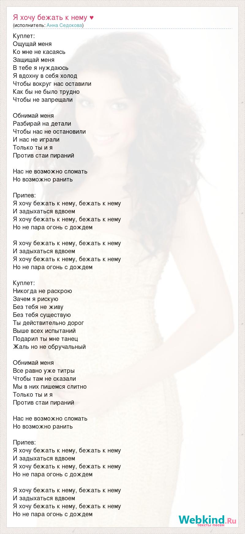 Куплет: Ощущай меня Ко мне не касаясь Защищай меня В тебе я нуждаюсь Я вдохну в себя холод Чтобы вокруг нас оставили Как бы не было трудно Чтобы не запрещали Обнимай меня Разбирай на детали Чтобы нас не остановили И нас не играли Только ты и я Против стаи пираний Нас не возможно сломать Но возможно ранить Припев: Я хочу бежать к нему, бежать к нему И задыхаться вдвоем Я хочу бежать к нему, бежать к нему Но не пара огонь с дождем Я хочу бежать к нему, бежать к нему И задыхаться вдвоем Я хочу бежать к нему, бежать к нему Но не пара огонь с дождем Куплет: Никогда не раскрою Зачем я рискую Без тебя не живу Без тебя существую Ты действительно дорог Выше всех испытаний Подарил ты мне танец Жаль но не обручальный Обнимай меня Все равно уже титры Чтобы там не сказали Мы в них пишемся слитно Только ты и я Против стаи пираний Нас не возможно сломать Но возможно ранить Припев: Я хочу бежать к нему, бежать к нему И задыхаться вдвоем Я хочу бежать к нему, бежать к нему Но не пара огонь с дождем Я хочу бежать к нему, бежать к нему И задыхаться вдвоем Я хочу бежать к нему, бежать к нему Но не пара огонь с дождем