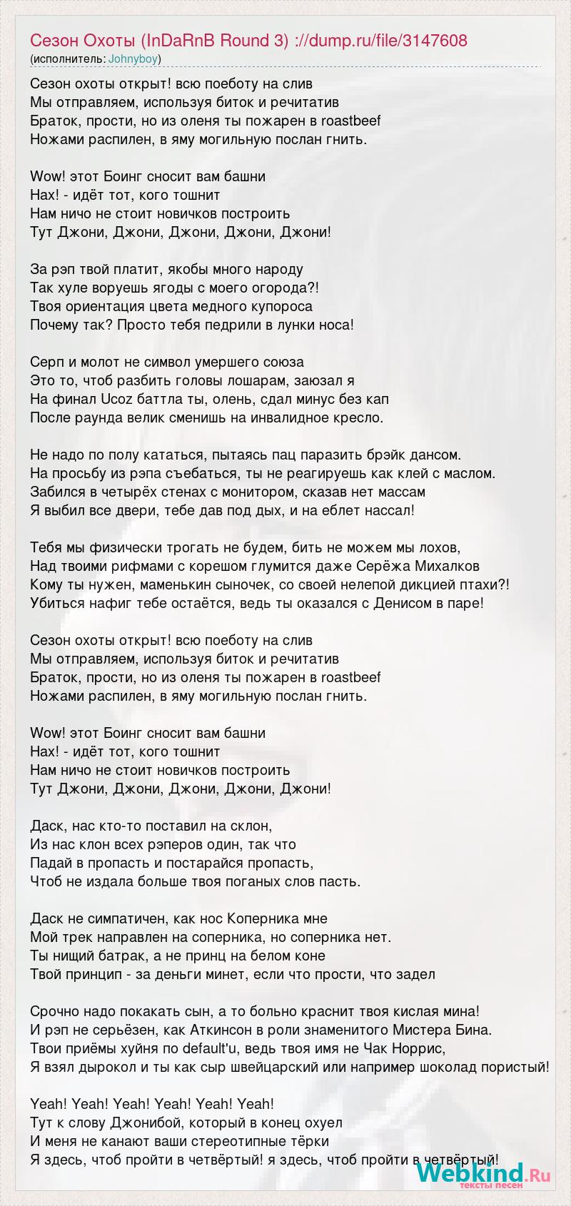 Сезон охоты открыт! всю поеботу на слив Мы отправляем, используя биток и речитатив Браток, прости, но из оленя ты пожарен в roastbeef Ножами распилен, в яму могильную послан гнить. Wow! этот Боинг сносит вам башни Нах! - идёт тот, кого тошнит Нам ничо не стоит новичков построить Тут Джони, Джони, Джони, Джони, Джони! За рэп твой платит, якобы много народу Так хуле воруешь ягоды с моего огорода?! Твоя ориентация цвета медного купороса Почему так? Просто тебя педрили в лунки носа! Серп и молот не символ умершего союза Это то, чтоб разбить головы лошарам, заюзал я На финал Ucoz баттла ты, олень, сдал минус без кап После раунда велик сменишь на инвалидное кресло. Не надо по полу кататься, пытаясь пац паразить брэйк дансом. На просьбу из рэпа съебаться, ты не реагируешь как клей с маслом. Забился в четырёх стенах с монитором, сказав нет массам Я выбил все двери, тебе дав под дых, и на еблет нассал! Тебя мы физически трогать не будем, бить не можем мы лохов, Над твоими рифмами с корешом глумится даже Серёжа Михалков Кому ты нужен, маменькин сыночек, со своей нелепой дикцией птахи?! Убиться нафиг тебе остаётся, ведь ты оказался с Денисом в паре! Сезон охоты открыт! всю поеботу на слив Мы отправляем, используя биток и речитатив Браток, прости, но из оленя ты пожарен в roastbeef Ножами распилен, в яму могильную послан гнить. Wow! этот Боинг сносит вам башни Нах! - идёт тот, кого тошнит Нам ничо не стоит новичков построить Тут Джони, Джони, Джони, Джони, Джони! Даск, нас кто-то поставил на склон, Из нас клон всех рэперов один, так что Падай в пропасть и постарайся пропасть, Чтоб не издала больше твоя поганых слов пасть. Даск не симпатичен, как нос Коперника мне Мой трек направлен на соперника, но соперника нет. Ты нищий батрак, а не принц на белом коне Твой принцип - за деньги минет, если что прости, что задел Срочно надо покакать сын, а то больно краснит твоя кислая мина! И рэп не серьёзен, как Аткинсон в роли знаменитого Мистера Бина. Твои приёмы хуйня по default'u, ведь твоя имя не Чак Норрис, Я взял дырокол и ты как сыр швейцарский или например шоколад пористый! Yeah! Yeah! Yeah! Yeah! Yeah! Yeah! Тут к слову Джонибой, который в конец охуел И меня не канают ваши стереотипные тёрки Я здесь, чтоб пройти в четвёртый! я здесь, чтоб пройти в четвёртый!