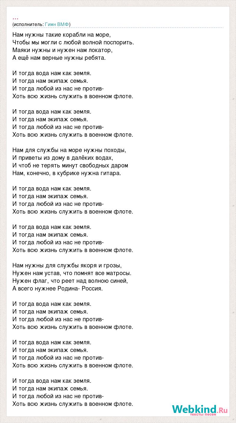 Нам нужны такие корабли на море, Чтобы мы могли с любой волной поспорить. Маяки нужны и нужен нам локатор, А ещё нам верные нужны ребята. И тогда вода нам как земля. И тогда нам экипаж семья. И тогда любой из нас не против- Хоть всю жизнь служить в военном флоте. И тогда вода нам как земля. И тогда нам экипаж семья. И тогда любой из нас не против- Хоть всю жизнь служить в военном флоте. Нам для службы на море нужны походы, И приветы из дому в далёких водах, И чтоб не терять минут свободных даром Нам, конечно, в кубрике нужна гитара. И тогда вода нам как земля. И тогда нам экипаж семья. И тогда любой из нас не против- Хоть всю жизнь служить в военном флоте. И тогда вода нам как земля. И тогда нам экипаж семья. И тогда любой из нас не против- Хоть всю жизнь служить в военном флоте. Нам нужны для службы якоря и грозы, Нужен нам устав, что помнят все матросы. Нужен флаг, что реет над волною синей, А всего нужнее Родина- Россия. И тогда вода нам как земля. И тогда нам экипаж семья. И тогда любой из нас не против- Хоть всю жизнь служить в военном флоте. И тогда вода нам как земля. И тогда нам экипаж семья. И тогда любой из нас не против- Хоть всю жизнь служить в военном флоте. И тогда вода нам как земля. И тогда нам экипаж семья. И тогда любой из нас не против- Хоть всю жизнь служить в военном флоте.