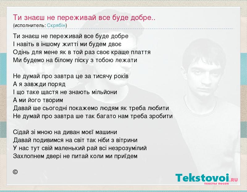 Ти знаєш не переживай все буде добре І навіть в іншому житті ми будем двоє Одінь для мене як в той раз своє краще плаття Ми будемо на білому піску з тобою лежати Не думай про завтра це за тисячу років А я завжди поряд І що таке щастя не знають мільйони А ми його творим Давай ше сьогодні покажемо людям як треба любити Не думай про завтра ше так багато нам треба зробити Сідай зі мною на диван моєї машини Давай подивимся на світ так ніби з вітрини У нас тут свій маленький рай всі незрозумілий Захлопнем двері не питай коли ми приїдем ©