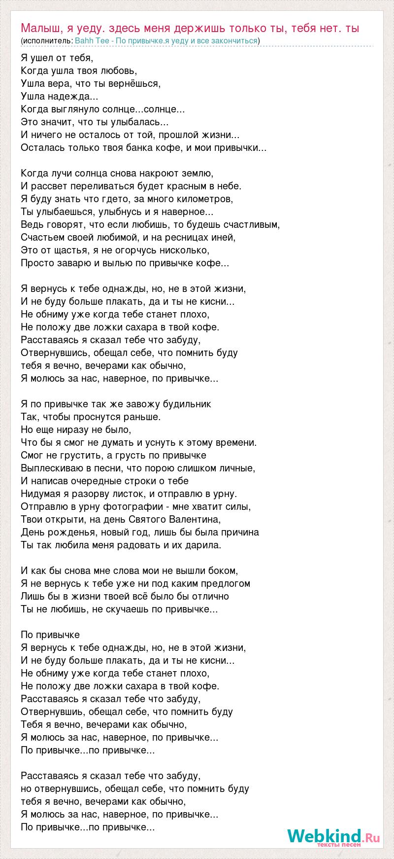 Я ушел от тебя, Когда ушла твоя любовь, Ушла вера, что ты вернёшься, Ушла надежда... Когда выглянуло солнце...солнце... Это значит, что ты улыбалась... И ничего не осталось от той, прошлой жизни... Осталась только твоя банка кофе, и мои привычки... Когда лучи солнца снова накроют землю, И рассвет переливаться будет красным в небе. Я буду знать что гдето, за много километров, Ты улыбаешься, улыбнусь и я наверное... Ведь говорят, что если любишь, то будешь счастливым, Счастьем своей любимой, и на ресницах иней, Это от щастья, я не огорчусь нисколько, Просто заварю и вылью по привычке кофе... Я вернусь к тебе однажды, но, не в этой жизни, И не буду больше плакать, да и ты не кисни... Не обниму уже когда тебе станет плохо, Не положу две ложки сахара в твой кофе. Расставаясь я сказал тебе что забуду, Отвернувшись, обещал себе, что помнить буду тебя я вечно, вечерами как обычно, Я молюсь за нас, наверное, по привычке... Я по привычке так же завожу будильник Так, чтобы проснутся раньше. Но еще ниразу не было, Что бы я смог не думать и уснуть к этому времени. Смог не грустить, а грусть по привычке Выплескиваю в песни, что порою слишком личные, И написав очередные строки о тебе Нидумая я разорву листок, и отправлю в урну. Отправлю в урну фотографии - мне хватит силы, Твои открыти, на день Святого Валентина, День рожденья, новый год, лишь бы была причина Ты так любила меня радовать и их дарила. И как бы снова мне слова мои не вышли боком, Я не вернусь к тебе уже ни под каким предлогом Лишь бы в жизни твоей всё было бы отлично Ты не любишь, не скучаешь по привычке... По привычке Я вернусь к тебе однажды, но, не в этой жизни, И не буду больше плакать, да и ты не кисни... Не обниму уже когда тебе станет плохо, Не положу две ложки сахара в твой кофе. Расставаясь я сказал тебе что забуду, Отвернувшиь, обещал себе, что помнить буду Тебя я вечно, вечерами как обычно, Я молюсь за нас, наверное, по привычке... По привычке...по привычке... Расставаясь я сказал тебе что забуду, но отвернувшись, обещал себе, что помнить буду тебя я вечно, вечерами как обычно, Я молюсь за нас, наверное, по привычке... По привычке...по привычке...