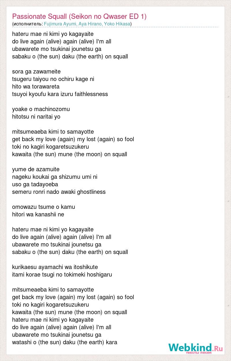 hateru mae ni kimi yo kagayaite do live again (alive) again (alive) I'm all ubawarete mo tsukinai jounetsu ga sabaku o (the sun) daku (the earth) on squall sora ga zawameite tsugeru taiyou no ochiru kage ni hito wa torawareta tsuyoi kyoufu kara izuru faithlessness yoake o machinozomu hitotsu ni naritai yo mitsumeaeba kimi to samayotte get back my love (again) my lost (again) so fool toki no kagiri kogaretsuzukeru kawaita (the sun) mune (the moon) on squall yume de azamuite nageku koukai ga shizumu umi ni uso ga tadayoeba semeru ronri nado awaki ghostliness omowazu tsume o kamu hitori wa kanashii ne hateru mae ni kimi yo kagayaite do live again (alive) again (alive) I'm all ubawarete mo tsukinai jounetsu ga sabaku o (the sun) daku (the earth) on squall kurikaesu ayamachi wa itoshikute itami korae tsugi no tokimeki hoshigaru mitsumeaeba kimi to samayotte get back my love (again) my lost (again) so fool toki no kagiri kogaretsuzukeru kawaita (the sun) mune (the moon) on squall hateru mae ni kimi yo kagayaite do live again (alive) again (alive) I'm all ubawarete mo tsukinai jounetsu ga watashi o (the sun) daku (the earth) kara