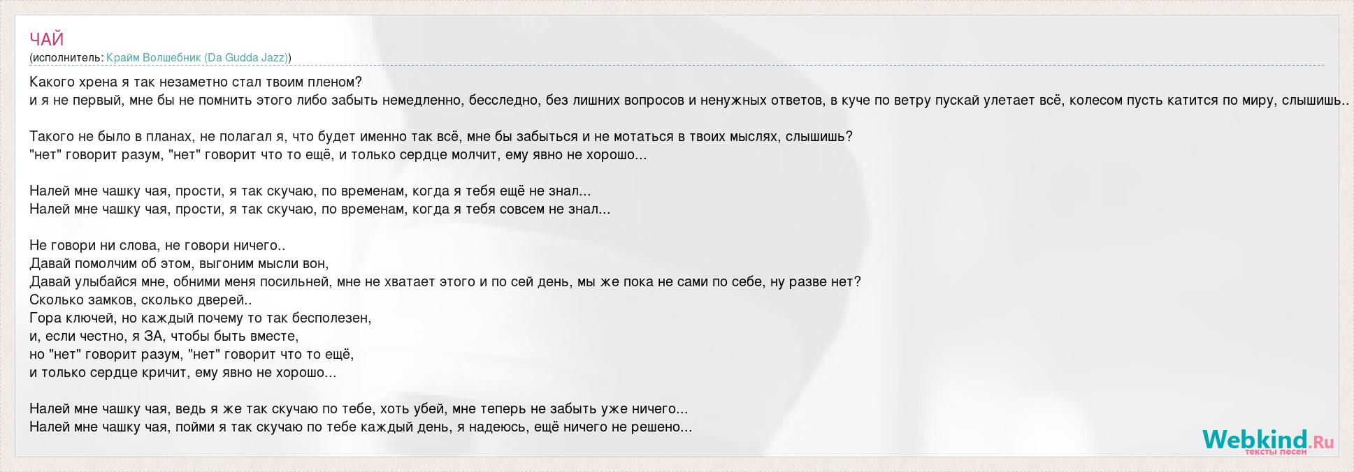 Какого хрена я так незаметно стал твоим пленом? и я не первый, мне бы не помнить этого либо забыть немедленно, бесследно, без лишних вопросов и ненужных ответов, в куче по ветру пускай улетает всё, колесом пусть катится по миру, слышишь.. Такого не было в планах, не полагал я, что будет именно так всё, мне бы забыться и не мотаться в твоих мыслях, слышишь? "нет" говорит разум, "нет" говорит что то ещё, и только сердце молчит, ему явно не хорошо... Налей мне чашку чая, прости, я так скучаю, по временам, когда я тебя ещё не знал... Налей мне чашку чая, прости, я так скучаю, по временам, когда я тебя совсем не знал... Не говори ни слова, не говори ничего.. Давай помолчим об этом, выгоним мысли вон, Давай улыбайся мне, обними меня посильней, мне не хватает этого и по сей день, мы же пока не сами по себе, ну разве нет? Сколько замков, сколько дверей.. Гора ключей, но каждый почему то так бесполезен, и, если честно, я ЗА, чтобы быть вместе, но "нет" говорит разум, "нет" говорит что то ещё, и только сердце кричит, ему явно не хорошо... Налей мне чашку чая, ведь я же так скучаю по тебе, хоть убей, мне теперь не забыть уже ничего... Налей мне чашку чая, пойми я так скучаю по тебе каждый день, я надеюсь, ещё ничего не решено...