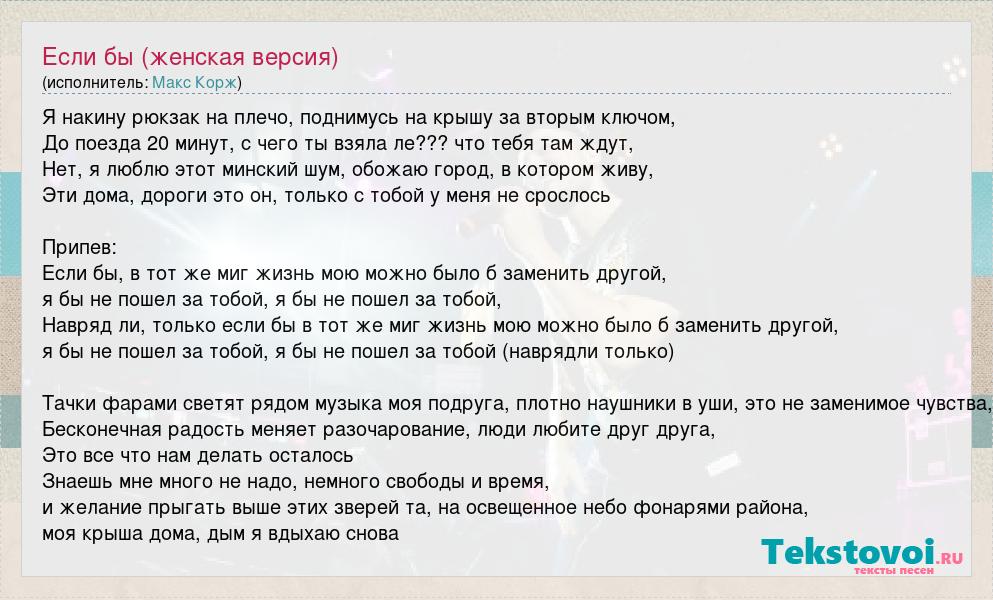Я накину рюкзак на плечо, поднимусь на крышу за вторым ключом, До поезда 20 минут, с чего ты взяла ле??? что тебя там ждут, Нет, я люблю этот минский шум, обожаю город, в котором живу, Эти дома, дороги это он, только с тобой у меня не срослось Припев: Если бы, в тот же миг жизнь мою можно было б заменить другой, я бы не пошел за тобой, я бы не пошел за тобой, Навряд ли, только если бы в тот же миг жизнь мою можно было б заменить другой, я бы не пошел за тобой, я бы не пошел за тобой (наврядли только) Тачки фарами светят рядом музыка моя подруга, плотно наушники в уши, это не заменимое чувства, Бесконечная радость меняет разочарование, люди любите друг друга, Это все что нам делать осталось Знаешь мне много не надо, немного свободы и время, и желание прыгать выше этих зверей та, на освещенное небо фонарями района, моя крыша дома, дым я вдыхаю снова