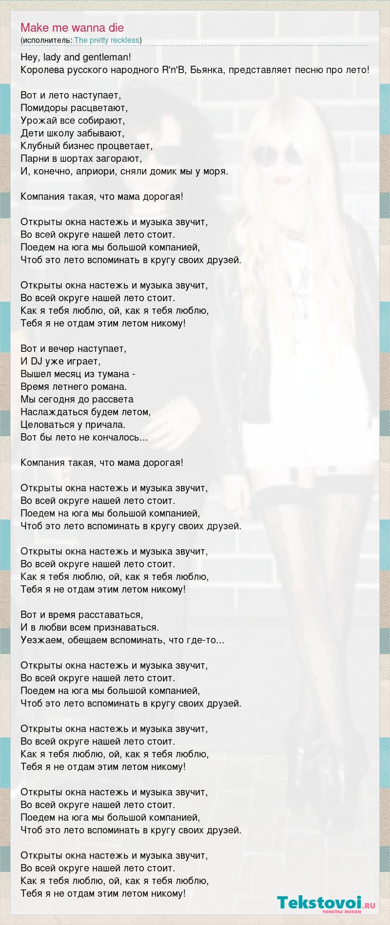 Hey, lady and gentleman! Королева русского народного R'n'B, Бьянка, представляет песню про лето! Вот и лето наступает, Помидоры расцветают, Урожай все собирают, Дети школу забывают, Клубный бизнес процветает, Парни в шортах загорают, И, конечно, априори, сняли домик мы у моря. Компания такая, что мама дорогая! Открыты окна настежь и музыка звучит, Во всей округе нашей лето стоит. Поедем на юга мы большой компанией, Чтоб это лето вспоминать в кругу своих друзей. Открыты окна настежь и музыка звучит, Во всей округе нашей лето стоит. Как я тебя люблю, ой, как я тебя люблю, Тебя я не отдам этим летом никому! Вот и вечер наступает, И DJ уже играет, Вышел месяц из тумана - Время летнего романа. Мы сегодня до рассвета Наслаждаться будем летом, Целоваться у причала. Вот бы лето не кончалось... Компания такая, что мама дорогая! Открыты окна настежь и музыка звучит, Во всей округе нашей лето стоит. Поедем на юга мы большой компанией, Чтоб это лето вспоминать в кругу своих друзей. Открыты окна настежь и музыка звучит, Во всей округе нашей лето стоит. Как я тебя люблю, ой, как я тебя люблю, Тебя я не отдам этим летом никому! Вот и время расставаться, И в любви всем признаваться. Уезжаем, обещаем вспоминать, что где-то... Открыты окна настежь и музыка звучит, Во всей округе нашей лето стоит. Поедем на юга мы большой компанией, Чтоб это лето вспоминать в кругу своих друзей. Открыты окна настежь и музыка звучит, Во всей округе нашей лето стоит. Как я тебя люблю, ой, как я тебя люблю, Тебя я не отдам этим летом никому! Открыты окна настежь и музыка звучит, Во всей округе нашей лето стоит. Поедем на юга мы большой компанией, Чтоб это лето вспоминать в кругу своих друзей. Открыты окна настежь и музыка звучит, Во всей округе нашей лето стоит. Как я тебя люблю, ой, как я тебя люблю, Тебя я не отдам этим летом никому!