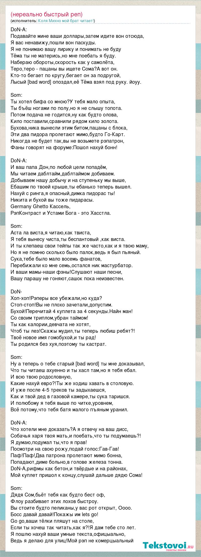 DoN-A: Подавайте мине ваши доллары,затем идите вон отсюда, Я вас ненавижу,пошли вон паскуды. Я не понимаю вашу лирику и понимать не буду Тёма ты не матерись,но мне поебать я буду. Набераю обороты,скорость как у самолёта, Теро,теро - пацаны вы ищете Сома?А вот он. Кто-то бегает по кругу,бегает он за подругой, Лысый [bad word] опоздал,её Тёма взял под руку. йоуу. Som: Ты хотел бифа со мною?У тебя мало опыта, Ты бъёш ногами по полу,но я не слышу топота. Потом подача не годится,ну как будто олова, Кило поставили,сравнили рядом кило золота. Бухова,ника вынесли этим битом,пацаны с блока, Эти два пидора пролетают мимо,будто Го-Карт. Никогда не будет так,вы не возьмете рэпатрон, Фаны говорят на форуме:Пошол нахуй бонн! DoN-A: И ваш папа Дон,по любой цели попадём, Мы читаем даблтайм,даблтаймом добиваем. Добываем нашу добычу и на ступеньку мы выше, Ебашим по твоей крыше,ты ебанько теперь вышел. Нахуй с ринга,я опасный,димка пидорас ты! Никита и бухой вы тоже пидарасы. Germany Ghetto Кассель, РэпКонтраст и Устами Бога - это Хасстла. Som: Аста ла виста,я читаю,как твиста, Я тебя вынесу чиста,ты беспантовый ,как виста. И ты клепаеш свои тейпы так же часто,как и я твою маму, Но я не помню сколько было палок,ведь я был пьяный. Сука,тебе было мало восемь фанатов, Перебижали ко мне семь,остался ник мастурбатор. И ваши мамы-наши фэны!Слушают наши песни, Вашу парашу не гоняют,сашок пока неизвестен. DoN- Хоп-хоп!Рэперы все убежали,но куда? Стоп-стоп!Вы не плохо зачетали,допустим. Бухой!Перечитай 4 куплета за 4 секунды.Найн ман! Со своим триплом,убран таймом! Ты как калории,девчата не хотят, Чтоб ты лез!Скажы мудил,ты теперь любиш ребят?! Твоё новое имя гомобухой,и ты рад! Ты родился без хуя,поэтому ты кастрат. Som: Ну а теперь о тебе старый [bad word] ты мне доказывал, Что ты читаеш ахуенно и ты хасл там,но я тебя ебал. И всю твою родословную, Какие нахуй евро?!Ты же ходиш хавать в столовую. И уже после 4-5 треков ты задыхаешся, Как и твой дед в газовой камере,ты сука таришся. И полюбому я тебя выше по читке,уровнем, Всё потому,что тебя батя малого пъяным уранил. DoN-A: Что хотели мне доказать?А я отвечу на ваш дисс, Собачья харя твоя мать,и поебать,что ты подумаешь?! Я думаю,подумал ты,что я прав! Посмотри на свою рожу,подай голос:Гав-Гав! Паф!Паф!Два патрона пролетают мимо бонна, Попадают,диме больно,в голове железа тонна. DoN-A,рифмы как бетон,и твёрдые и на районах, Мой куплет пришол к концу,слушай дальше дядю Сома! Som: Дядя Сом,бьёт тебя как будто бест оф, Флоу разбивает этих лохов быстроу. Вы стоите будто пеликаны,у вас рот открыт, Оооо. Босс давай давай!Покажы им lets go! Go go,ваши тёлки пляшут на столе, Если ты хочеш так читать,как я?!Я дам тебе сто лет. Я пошлю нахуй ваши умные текста,офицыально, Ведь я делаю для улиц!Мой рэп не комерцыальный