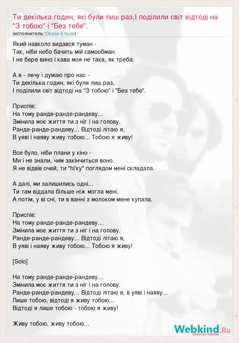 Який навколо видався туман - Так, ніби небо бачить мій самообман. І не бере вино і кава моя не така, як треба. А я - лечу і думаю про нас - Ти декілька годин, які були лиш раз, І поділили світ відтоді на "З тобою" i "Без тебе". Приспів: На тому ранде-ранде-рандеву... Змінила моє життя ти з ніг і на голову. Ранде-ранде-рандеву... Відтоді літаю я, В уяві і наяву живу тобою... Тобою я живу! Все було, ніби плани у кіно - Ми і не знали, чим закінчиться воно. Я не відвів очей, ти "hi'ку" поглядом мені складала. А далі, ми залишились одні... Ти там віддала більше ніж могла мені, А потім, у ві сні, ти в ванні з молоком мене купала. Приспів: На тому ранде-ранде-рандеву... Змінила моє життя ти з ніг і на голову. Ранде-ранде-рандеву... Відтоді літаю я, В уяві і наяву живу тобою... Тобою я живу! [Solo] На тому ранде-ранде-рандеву... Змінила моє життя ти з ніг і на голову. Ранде-ранде-рандеву... Відтоді літаю я, в уяві і наяву... Лише тобою, відтоді я живу тобою... Відтоді я лише тобою - тобою я живу! Живу тобою, живу тобою...