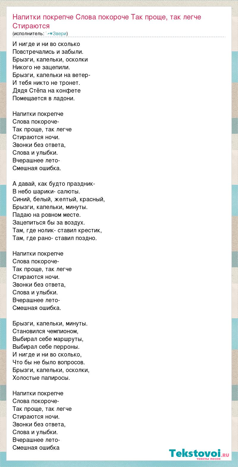 И нигде и ни во сколько Повстречались и забыли. Брызги, капельки, осколки Никого не зацепили. Брызги, капельки на ветер- И тебя никто не тронет. Дядя Стёпа на конфете Помещается в ладони. Напитки покрепче Слова покороче- Так проще, так легче Стираются ночи. Звонки без ответа, Слова и улыбки. Вчерашнее лето- Смешная ошибка. А давай, как будто праздник- В небо шарики- салюты. Синий, белый, желтый, красный, Брызги, капельки, минуты. Падаю на ровном месте. Зацепиться бы за воздух. Там, где нолик- ставил крестик, Там, где рано- ставил поздно. Напитки покрепче Слова покороче- Так проще, так легче Стираются ночи. Звонки без ответа, Слова и улыбки. Вчерашнее лето- Смешная ошибка. Брызги, капельки, минуты. Становился чемпионом, Выбирал себе маршруты, Выбирал себе перроны. И нигде и ни во сколько, Что бы не было вопросов. Брызги, капельки, осколки, Холостые папиросы. Напитки покрепче Слова покороче- Так проще, так легче Стираются ночи. Звонки без ответа, Слова и улыбки. Вчерашнее лето- Смешная ошибка