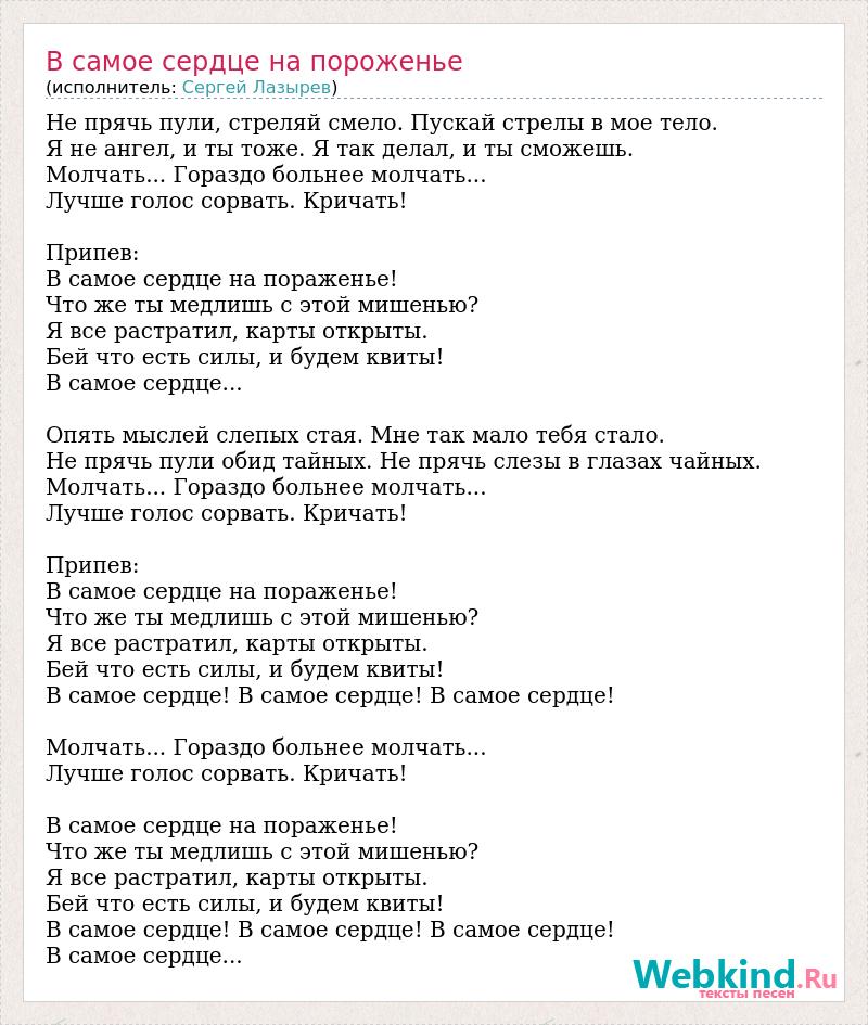 Не прячь пули, стреляй смело. Пускай стрелы в мое тело. Я не ангел, и ты тоже. Я так делал, и ты сможешь. Молчать... Гораздо больнее молчать... Лучше голос сорвать. Кричать! Припев: В самое сердце на пораженье! Что же ты медлишь с этой мишенью? Я все растратил, карты открыты. Бей что есть силы, и будем квиты! В самое сердце... Опять мыслей слепых стая. Мне так мало тебя стало. Не прячь пули обид тайных. Не прячь слезы в глазах чайных. Молчать... Гораздо больнее молчать... Лучше голос сорвать. Кричать! Припев: В самое сердце на пораженье! Что же ты медлишь с этой мишенью? Я все растратил, карты открыты. Бей что есть силы, и будем квиты! В самое сердце! В самое сердце! В самое сердце! Молчать... Гораздо больнее молчать... Лучше голос сорвать. Кричать! В самое сердце на пораженье! Что же ты медлишь с этой мишенью? Я все растратил, карты открыты. Бей что есть силы, и будем квиты! В самое сердце! В самое сердце! В самое сердце! В самое сердце...