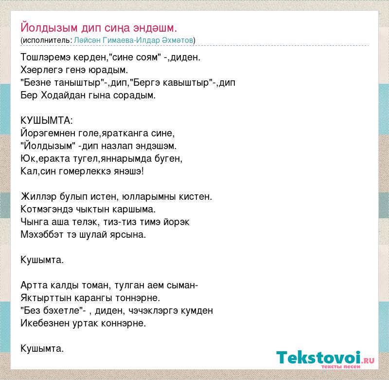 Тошлэремэ керден,"сине соям" -,диден. Хэерлегэ генэ юрадым. "Безне таныштыр"-,дип,"Бергэ кавыштыр"-,дип Бер Ходайдан гына сорадым. КУШЫМТА: Йорэгемнен голе,яратканга сине, "Йолдызым" -дип назлап эндэшэм. Юк,еракта тугел,яннарымда буген, Кал,син гомерлеккэ янэшэ! Жиллэр булып истен, юлларымны кистен. Котмэгэндэ чыктын каршыма. Чынга аша телэк, тиз-тиз тимэ йорэк Мэхэббэт тэ шулай ярсына. Кушымта. Артта калды томан, тулган аем сыман- Яктырттын карангы тоннэрне. "Без бэхетле"- , диден, чэчэклэргэ кумден Икебезнен уртак коннэрне. Кушымта.