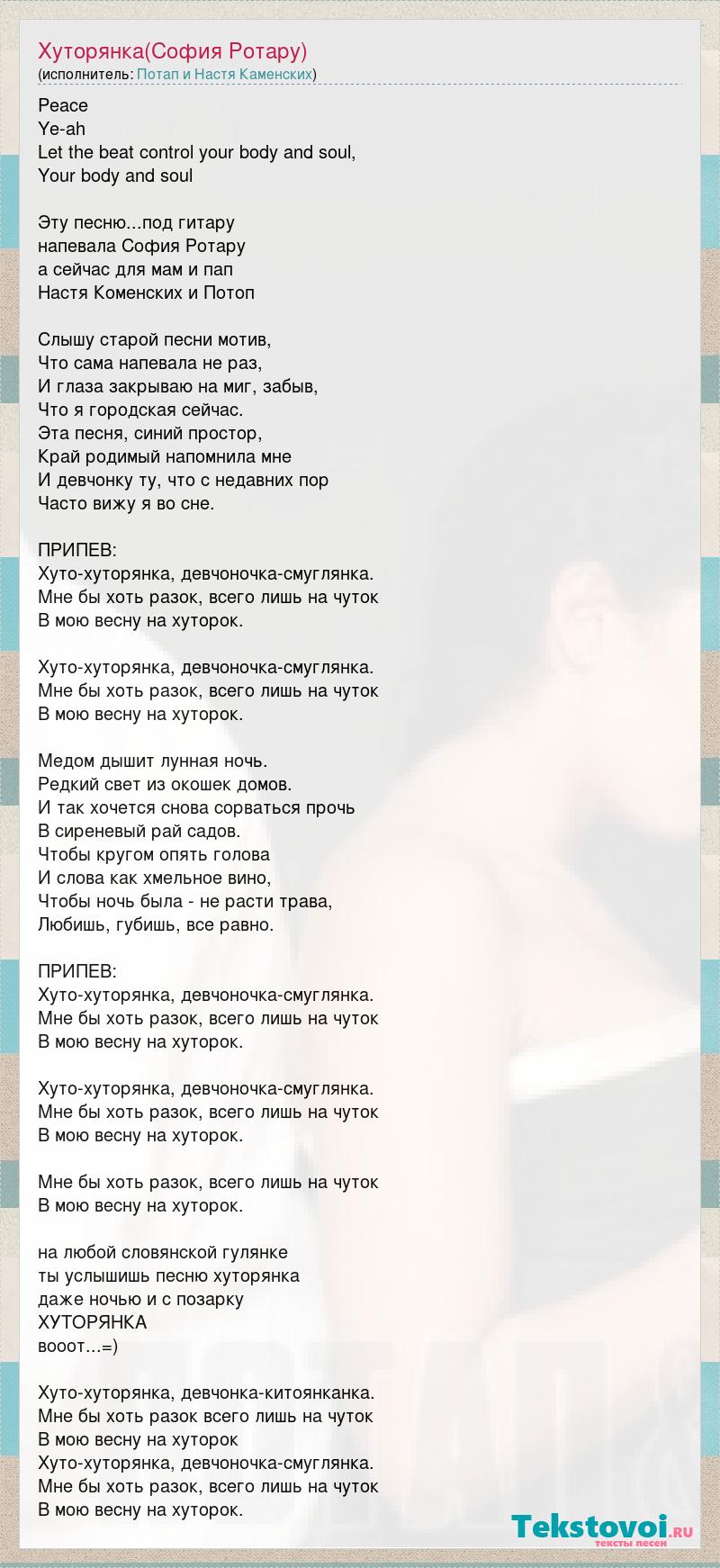 Peace Ye-ah Let the beat control your body and soul, Your body and soul Эту песню...под гитару напевала София Ротару а сейчас для мам и пап Настя Коменских и Потоп Слышу старой песни мотив, Что сама напевала не раз, И глаза закрываю на миг, забыв, Что я городская сейчас. Эта песня, синий простор, Край родимый напомнила мне И девчонку ту, что с недавних пор Часто вижу я во сне. ПРИПЕВ: Хуто-хуторянка, девчоночка-смуглянка. Мне бы хоть разок, всего лишь на чуток В мою весну на хуторок. Хуто-хуторянка, девчоночка-смуглянка. Мне бы хоть разок, всего лишь на чуток В мою весну на хуторок. Медом дышит лунная ночь. Редкий свет из окошек домов. И так хочется снова сорваться прочь В сиреневый рай садов. Чтобы кругом опять голова И слова как хмельное вино, Чтобы ночь была - не расти трава, Любишь, губишь, все равно. ПРИПЕВ: Хуто-хуторянка, девчоночка-смуглянка. Мне бы хоть разок, всего лишь на чуток В мою весну на хуторок. Хуто-хуторянка, девчоночка-смуглянка. Мне бы хоть разок, всего лишь на чуток В мою весну на хуторок. Мне бы хоть разок, всего лишь на чуток В мою весну на хуторок. на любой словянской гулянке ты услышишь песню хуторянка даже ночью и с позарку ХУТОРЯНКА вооот...=) Хуто-хуторянка, девчонка-китоянканка. Мне бы хоть разок всего лишь на чуток В мою весну на хуторок Хуто-хуторянка, девчоночка-смуглянка. Мне бы хоть разок, всего лишь на чуток В мою весну на хуторок.