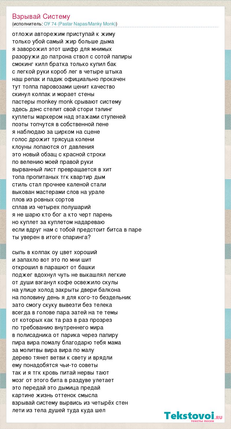 отложи авторежим приступай к жиму только убой самый жир больше дыма я заворожил этот шифр для мнимых разоружи до патрона ствол с сотой папиры смокинг килл братка только купил бак с легкой руки короб лег в четыре штыка наш репак и падик официально прокачен тут толпа паровозами ценит качество скинул колпак и морает стены пастеры monkey monk срывают систему здесь дэнс стелит свой стори тэлинг куплеты маркером над этажами ступеней поэты топчутся в собственной пене я наблюдаю за цирком на сцене голос дрожит трясуца колени клоуны лопаются от давления это новый обзац с красной строки по велению моей правой руки вырванный лист превращается в хит топа пропитаных тгк квартир дым стиль стал прочнее каленой стали выкован мастерами слов на урале плов из ровных сортов сплав из четырех полушарий я не шарю кто бог а кто черт парень но куплет за куплетом надареваю если вдруг нам с тобой предстоит битса в паре ты уверен в итоге спаринга? сыпь в колпак оу цвет хороший и запахло вот это по мни шит открошил в парашют от башки поджег вдохнул чуть не выкашлял легкие от души вэганул кофе освежило скулы на улице холод закрыты двери балкона на половину день я для кого-то бездельник зато смогу скуку вывезти без телека всегда в голове пара затей на те темы от которых как та раз в раз прозрез по требованию внутреннего мира в полисадника от парика через папиру пира вира помалу благодарю тебя мама за молитвы вира вира по малу дерево тянет ветви к свету и врядли ему понадобятся чьи-то советы так и я тгк кровь питай нервы тают мозг от этого бита в раздуве улетает это передай это дымица предай картине жизнь оттенок смысла взрывай систему вырвись из четырёх стен лети из тела душей туда куда шел