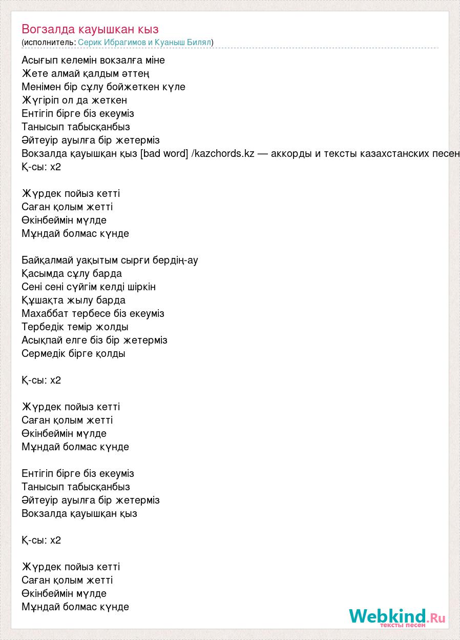 Асығып келемін вокзалға міне Жете алмай қалдым әттең Менімен бір сұлу бойжеткен күле Жүгіріп ол да жеткен Ентігіп бірге біз екеуміз Танысып табысқанбыз Әйтеуір ауылға бір жетерміз Вокзалда қауышқан қыз [bad word] /kazchords.kz — аккорды и тексты казахстанских песен Қ-сы: х2 Жүрдек пойыз кетті Саған қолым жетті Өкінбеймін мүлде Мұндай болмас күнде Байқалмай уақытым сырғи бердің-ау Қасымда сұлу барда Сені сені сүйгім келді шіркін Құшақта жылу барда Махаббат тербесе біз екеуміз Тербедік темір жолды Асықпай елге біз бір жетерміз Сермедік бірге қолды Қ-сы: х2 Жүрдек пойыз кетті Саған қолым жетті Өкінбеймін мүлде Мұндай болмас күнде Ентігіп бірге біз екеуміз Танысып табысқанбыз Әйтеуір ауылға бір жетерміз Вокзалда қауышқан қыз Қ-сы: х2 Жүрдек пойыз кетті Саған қолым жетті Өкінбеймін мүлде Мұндай болмас күнде