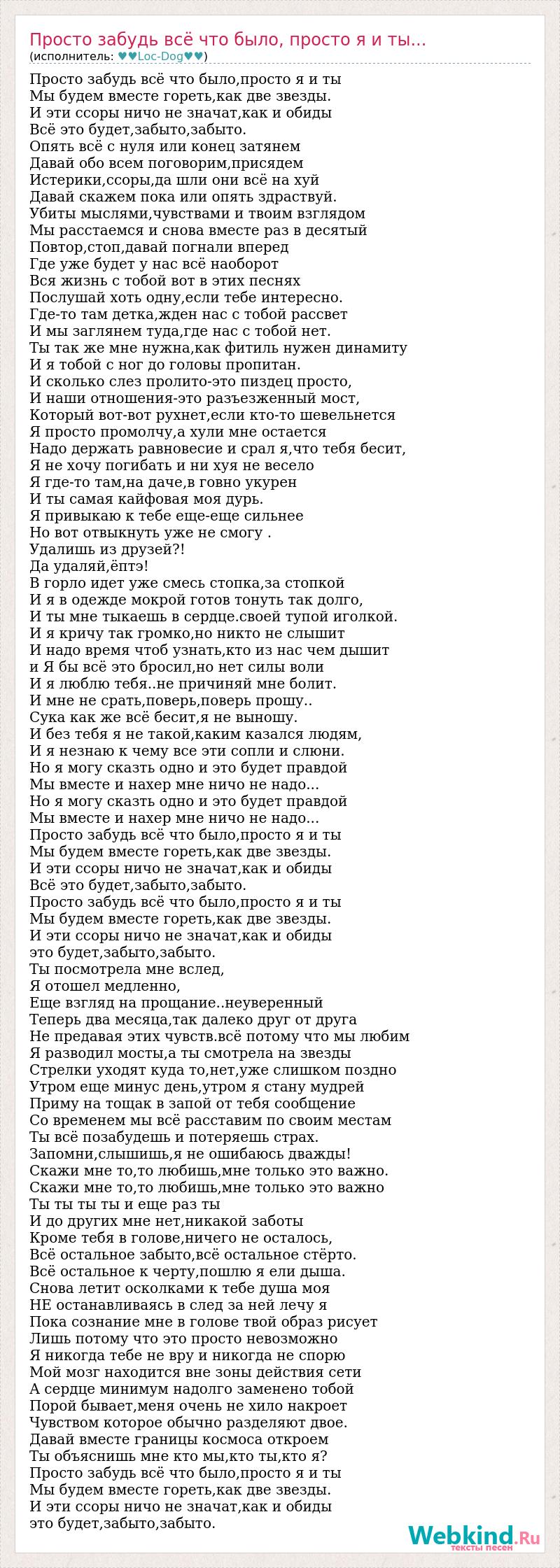 Просто забудь всё что было,просто я и ты Мы будем вместе гореть,как две звезды. И эти ссоры ничо не значат,как и обиды Всё это будет,забыто,забыто. Опять всё с нуля или конец затянем Давай обо всем поговорим,присядем Истерики,ссоры,да шли они всё на хуй Давай скажем пока или опять здраствуй. Убиты мыслями,чувствами и твоим взглядом Мы расстаемся и снова вместе раз в десятый Повтор,стоп,давай погнали вперед Где уже будет у нас всё наоборот Вся жизнь с тобой вот в этих песнях Послушай хоть одну,если тебе интересно. Где-то там детка,жден нас с тобой рассвет И мы заглянем туда,где нас с тобой нет. Ты так же мне нужна,как фитиль нужен динамиту И я тобой с ног до головы пропитан. И сколько слез пролито-это пиздец просто, И наши отношения-это разъезженный мост, Который вот-вот рухнет,если кто-то шевельнется Я просто промолчу,а хули мне остается Надо держать равновесие и срал я,что тебя бесит, Я не хочу погибать и ни хуя не весело Я где-то там,на даче,в говно укурен И ты самая кайфовая моя дурь. Я привыкаю к тебе еще-еще сильнее Но вот отвыкнуть уже не смогу . Удалишь из друзей?! Да удаляй,ёптэ! В горло идет уже смесь стопка,за стопкой И я в одежде мокрой готов тонуть так долго, И ты мне тыкаешь в сердце.своей тупой иголкой. И я кричу так громко,но никто не слышит И надо время чтоб узнать,кто из нас чем дышит и Я бы всё это бросил,но нет силы воли И я люблю тебя..не причиняй мне болит. И мне не срать,поверь,поверь прошу.. Сука как же всё бесит,я не выношу. И без тебя я не такой,каким казался людям, И я незнаю к чему все эти сопли и слюни. Но я могу сказть одно и это будет правдой Мы вместе и нахер мне ничо не надо... Но я могу сказть одно и это будет правдой Мы вместе и нахер мне ничо не надо... Просто забудь всё что было,просто я и ты Мы будем вместе гореть,как две звезды. И эти ссоры ничо не значат,как и обиды Всё это будет,забыто,забыто. Просто забудь всё что было,просто я и ты Мы будем вместе гореть,как две звезды. И эти ссоры ничо не значат,как и обиды это будет,забыто,забыто. Ты посмотрела мне вслед, Я отошел медленно, Еще взгляд на прощание..неуверенный Теперь два месяца,так далеко друг от друга Не предавая этих чувств.всё потому что мы любим Я разводил мосты,а ты смотрела на звезды Стрелки уходят куда то,нет,уже слишком поздно Утром еще минус день,утром я стану мудрей Приму на тощак в запой от тебя сообщение Со временем мы всё расставим по своим местам Ты всё позабудешь и потеряешь страх. Запомни,слышишь,я не ошибаюсь дважды! Скажи мне то,то любишь,мне только это важно. Скажи мне то,то любишь,мне только это важно Ты ты ты ты и еще раз ты И до других мне нет,никакой заботы Кроме тебя в голове,ничего не осталось, Всё остальное забыто,всё остальное стёрто. Всё остальное к черту,пошлю я ели дыша. Снова летит осколками к тебе душа моя НЕ останавливаясь в след за ней лечу я Пока сознание мне в голове твой образ рисует Лишь потому что это просто невозможно Я никогда тебе не вру и никогда не спорю Мой мозг находится вне зоны действия сети А сердце минимум надолго заменено тобой Порой бывает,меня очень не хило накроет Чувством которое обычно разделяют двое. Давай вместе границы космоса откроем Ты объяснишь мне кто мы,кто ты,кто я? Просто забудь всё что было,просто я и ты Мы будем вместе гореть,как две звезды. И эти ссоры ничо не значат,как и обиды это будет,забыто,забыто.