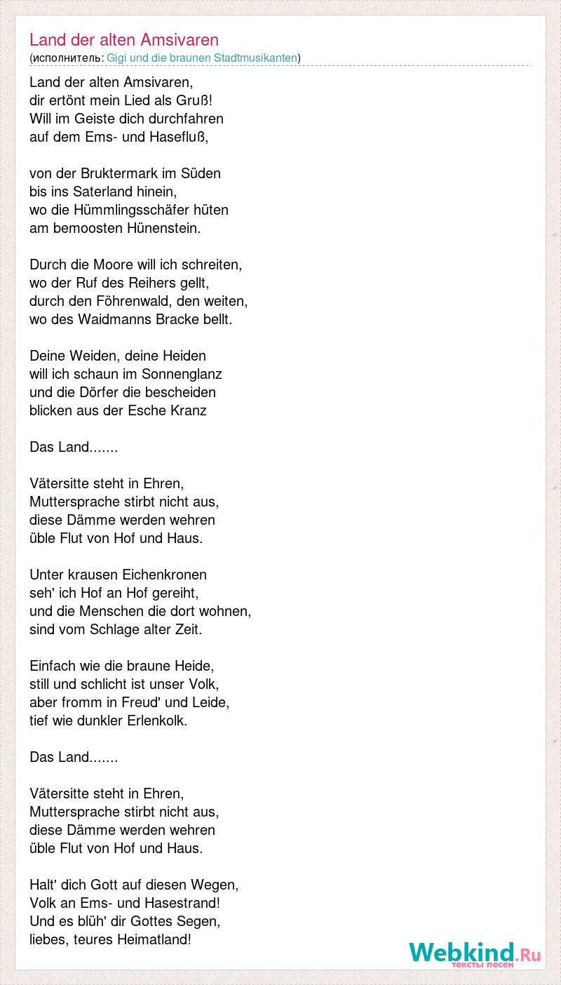 Land der alten Amsivaren, dir ertönt mein Lied als Gruß! Will im Geiste dich durchfahren auf dem Ems- und Hasefluß, von der Bruktermark im Süden bis ins Saterland hinein, wo die Hümmlingsschäfer hüten am bemoosten Hünenstein. Durch die Moore will ich schreiten, wo der Ruf des Reihers gellt, durch den Föhrenwald, den weiten, wo des Waidmanns Bracke bellt. Deine Weiden, deine Heiden will ich schaun im Sonnenglanz und die Dörfer die bescheiden blicken aus der Esche Kranz Das Land....... Vätersitte steht in Ehren, Muttersprache stirbt nicht aus, diese Dämme werden wehren üble Flut von Hof und Haus. Unter krausen Eichenkronen seh' ich Hof an Hof gereiht, und die Menschen die dort wohnen, sind vom Schlage alter Zeit. Einfach wie die braune Heide, still und schlicht ist unser Volk, aber fromm in Freud' und Leide, tief wie dunkler Erlenkolk. Das Land....... Vätersitte steht in Ehren, Muttersprache stirbt nicht aus, diese Dämme werden wehren üble Flut von Hof und Haus. Halt' dich Gott auf diesen Wegen, Volk an Ems- und Hasestrand! Und es blüh' dir Gottes Segen, liebes, teures Heimatland!