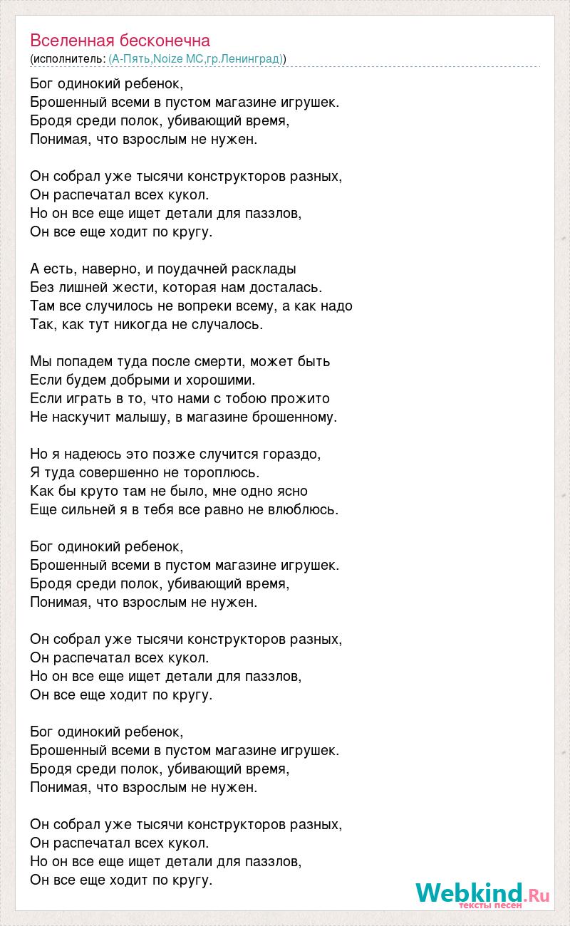 Бог одинокий ребенок, Брошенный всеми в пустом магазине игрушек. Бродя среди полок, убивающий время, Понимая, что взрослым не нужен. Он собрал уже тысячи конструкторов разных, Он распечатал всех кукол. Но он все еще ищет детали для паззлов, Он все еще ходит по кругу. А есть, наверно, и поудачней расклады Без лишней жести, которая нам досталась. Там все случилось не вопреки всему, а как надо Так, как тут никогда не случалось. Мы попадем туда после смерти, может быть Если будем добрыми и хорошими. Если играть в то, что нами с тобою прожито Не наскучит малышу, в магазине брошенному. Но я надеюсь это позже случится гораздо, Я туда совершенно не тороплюсь. Как бы круто там не было, мне одно ясно Еще сильней я в тебя все равно не влюблюсь. Бог одинокий ребенок, Брошенный всеми в пустом магазине игрушек. Бродя среди полок, убивающий время, Понимая, что взрослым не нужен. Он собрал уже тысячи конструкторов разных, Он распечатал всех кукол. Но он все еще ищет детали для паззлов, Он все еще ходит по кругу. Бог одинокий ребенок, Брошенный всеми в пустом магазине игрушек. Бродя среди полок, убивающий время, Понимая, что взрослым не нужен. Он собрал уже тысячи конструкторов разных, Он распечатал всех кукол. Но он все еще ищет детали для паззлов, Он все еще ходит по кругу.