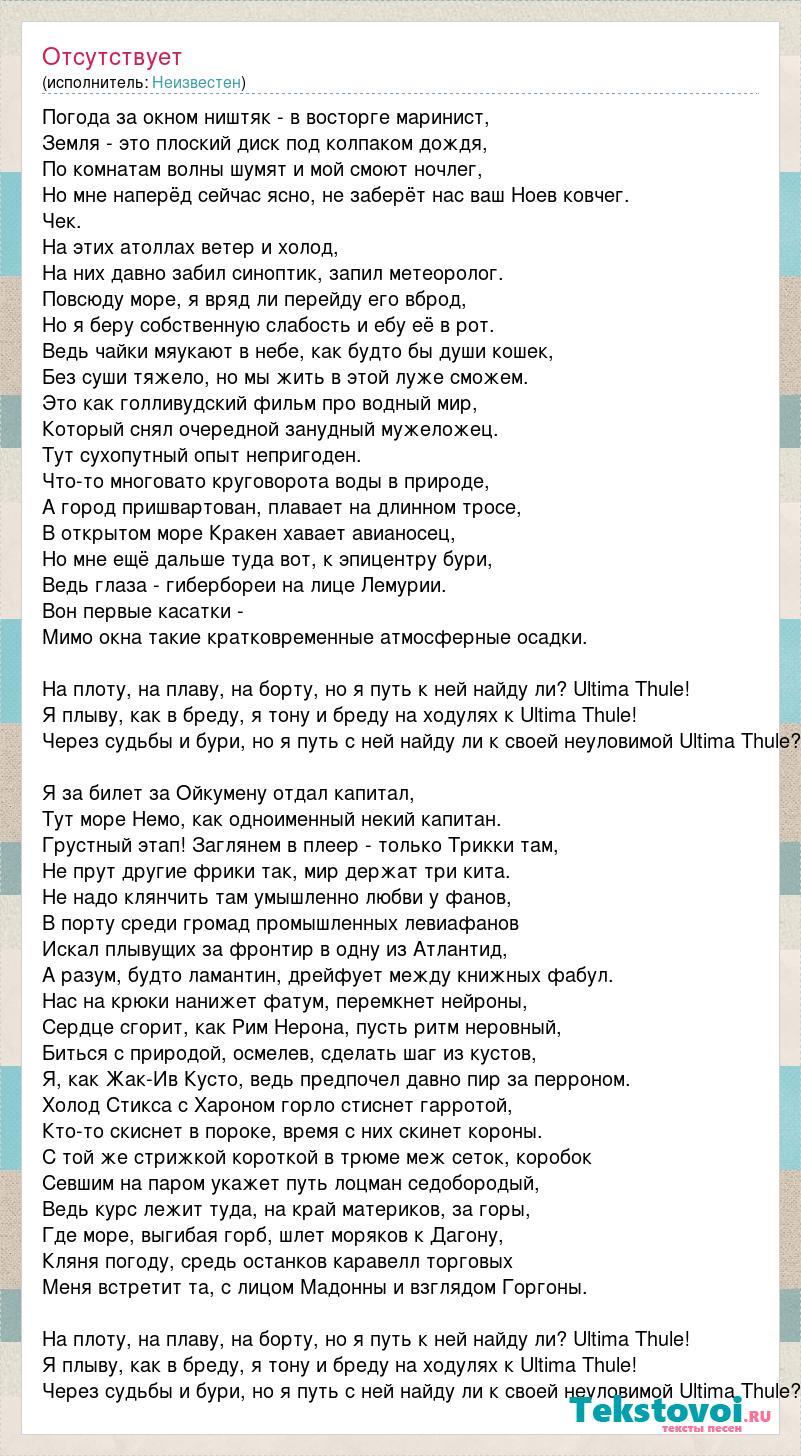Погода за окном ништяк - в восторге маринист, Земля - это плоский диск под колпаком дождя, По комнатам волны шумят и мой смоют ночлег, Но мне наперёд сейчас ясно, не заберёт нас ваш Ноев ковчег. Чек. На этих атоллах ветер и холод, На них давно забил синоптик, запил метеоролог. Повсюду море, я вряд ли перейду его вброд, Но я беру собственную слабость и ебу её в рот. Ведь чайки мяукают в небе, как будто бы души кошек, Без суши тяжело, но мы жить в этой луже сможем. Это как голливудский фильм про водный мир, Который снял очередной занудный мужеложец. Тут сухопутный опыт непригоден. Что-то многовато круговорота воды в природе, А город пришвартован, плавает на длинном тросе, В открытом море Кракен хавает авианосец, Но мне ещё дальше туда вот, к эпицентру бури, Ведь глаза - гибербореи на лице Лемурии. Вон первые касатки - Мимо окна такие кратковременные атмосферные осадки. На плоту, на плаву, на борту, но я путь к ней найду ли? Ultima Thule! Я плыву, как в бреду, я тону и бреду на ходулях к Ultima Thule! Через судьбы и бури, но я путь с ней найду ли к своей неуловимой Ultima Thule? Я за билет за Ойкумену отдал капитал, Тут море Немо, как одноименный некий капитан. Грустный этап! Заглянем в плеер - только Трикки там, Не прут другие фрики так, мир держат три кита. Не надо клянчить там умышленно любви у фанов, В порту среди громад промышленных левиафанов Искал плывущих за фронтир в одну из Атлантид, А разум, будто ламантин, дрейфует между книжных фабул. Нас на крюки нанижет фатум, перемкнет нейроны, Сердце сгорит, как Рим Нерона, пусть ритм неровный, Биться с природой, осмелев, сделать шаг из кустов, Я, как Жак-Ив Кусто, ведь предпочел давно пир за перроном. Холод Стикса с Хароном горло стиснет гарротой, Кто-то скиснет в пороке, время с них скинет короны. С той же стрижкой короткой в трюме меж сеток, коробок Севшим на паром укажет путь лоцман седобородый, Ведь курс лежит туда, на край материков, за горы, Где море, выгибая горб, шлет моряков к Дагону, Кляня погоду, средь останков каравелл торговых Меня встретит та, с лицом Мадонны и взглядом Горгоны. На плоту, на плаву, на борту, но я путь к ней найду ли? Ultima Thule! Я плыву, как в бреду, я тону и бреду на ходулях к Ultima Thule! Через судьбы и бури, но я путь с ней найду ли к своей неуловимой Ultima Thule?