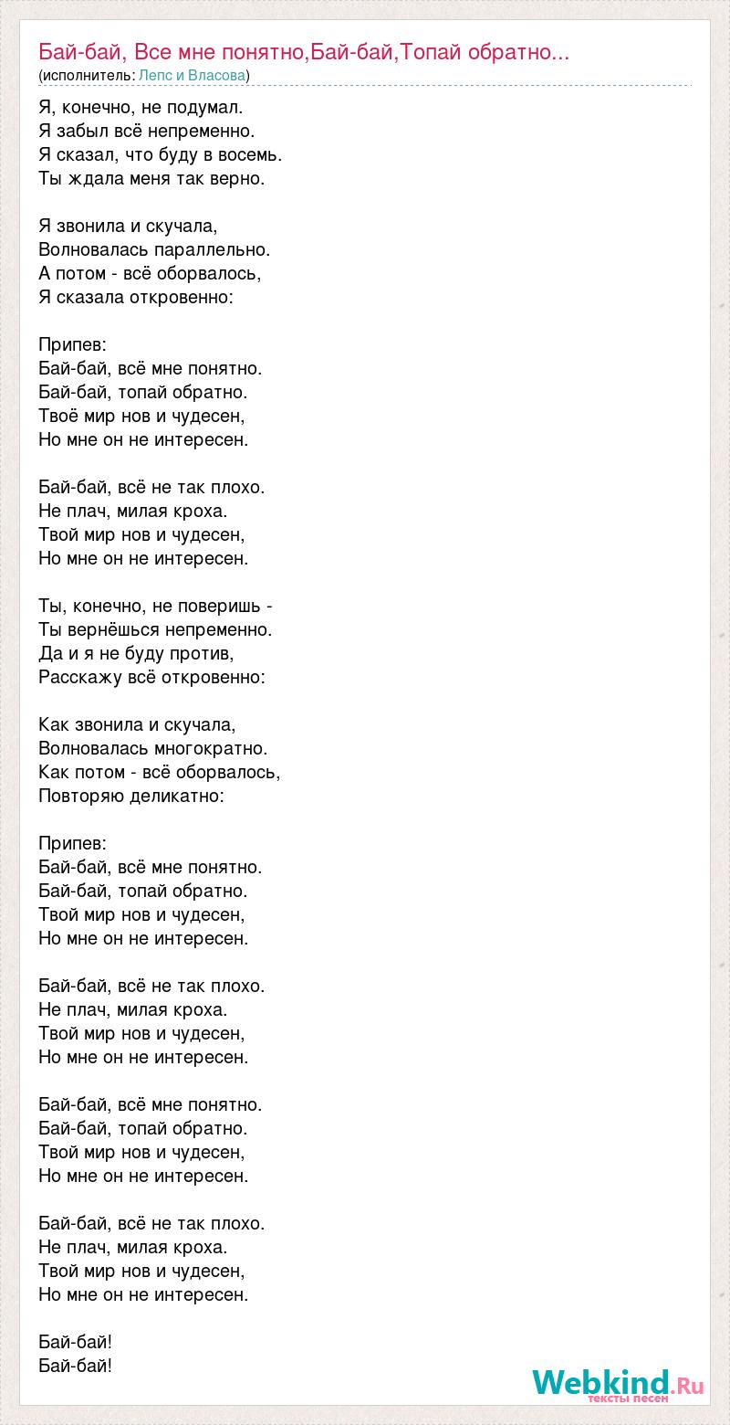 Я, конечно, не подумал. Я забыл всё непременно. Я сказал, что буду в восемь. Ты ждала меня так верно. Я звонила и скучала, Волновалась параллельно. А потом - всё оборвалось, Я сказала откровенно: Припев: Бай-бай, всё мне понятно. Бай-бай, топай обратно. Твоё мир нов и чудесен, Но мне он не интересен. Бай-бай, всё не так плохо. Не плач, милая кроха. Твой мир нов и чудесен, Но мне он не интересен. Ты, конечно, не поверишь - Ты вернёшься непременно. Да и я не буду против, Расскажу всё откровенно: Как звонила и скучала, Волновалась многократно. Как потом - всё оборвалось, Повторяю деликатно: Припев: Бай-бай, всё мне понятно. Бай-бай, топай обратно. Твой мир нов и чудесен, Но мне он не интересен. Бай-бай, всё не так плохо. Не плач, милая кроха. Твой мир нов и чудесен, Но мне он не интересен. Бай-бай, всё мне понятно. Бай-бай, топай обратно. Твой мир нов и чудесен, Но мне он не интересен. Бай-бай, всё не так плохо. Не плач, милая кроха. Твой мир нов и чудесен, Но мне он не интересен. Бай-бай! Бай-бай!