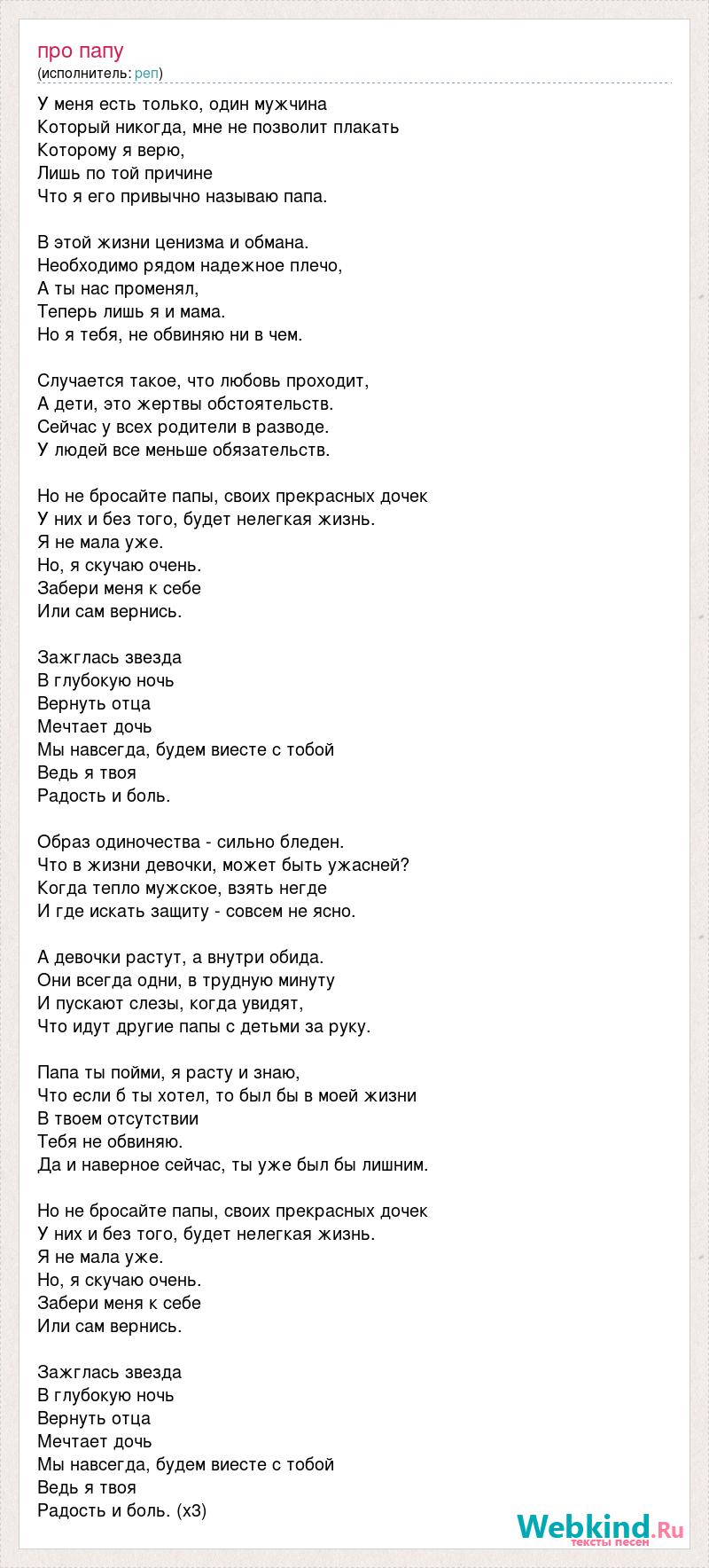 У меня есть только, один мужчина Который никогда, мне не позволит плакать Которому я верю, Лишь по той причине Что я его привычно называю папа. В этой жизни ценизма и обмана. Необходимо рядом надежное плечо, А ты нас променял, Теперь лишь я и мама. Но я тебя, не обвиняю ни в чем. Случается такое, что любовь проходит, А дети, это жертвы обстоятельств. Сейчас у всех родители в разводе. У людей все меньше обязательств. Но не бросайте папы, своих прекрасных дочек У них и без того, будет нелегкая жизнь. Я не мала уже. Но, я скучаю очень. Забери меня к себе Или сам вернись. Зажглась звезда В глубокую ночь Вернуть отца Мечтает дочь Мы навсегда, будем виесте с тобой Ведь я твоя Радость и боль. Образ одиночества - сильно бледен. Что в жизни девочки, может быть ужасней? Когда тепло мужское, взять негде И где искать защиту - совсем не ясно. А девочки растут, а внутри обида. Они всегда одни, в трудную минуту И пускают слезы, когда увидят, Что идут другие папы с детьми за руку. Папа ты пойми, я расту и знаю, Что если б ты хотел, то был бы в моей жизни В твоем отсутствии Тебя не обвиняю. Да и наверное сейчас, ты уже был бы лишним. Но не бросайте папы, своих прекрасных дочек У них и без того, будет нелегкая жизнь. Я не мала уже. Но, я скучаю очень. Забери меня к себе Или сам вернись. Зажглась звезда В глубокую ночь Вернуть отца Мечтает дочь Мы навсегда, будем виесте с тобой Ведь я твоя Радость и боль. (х3)