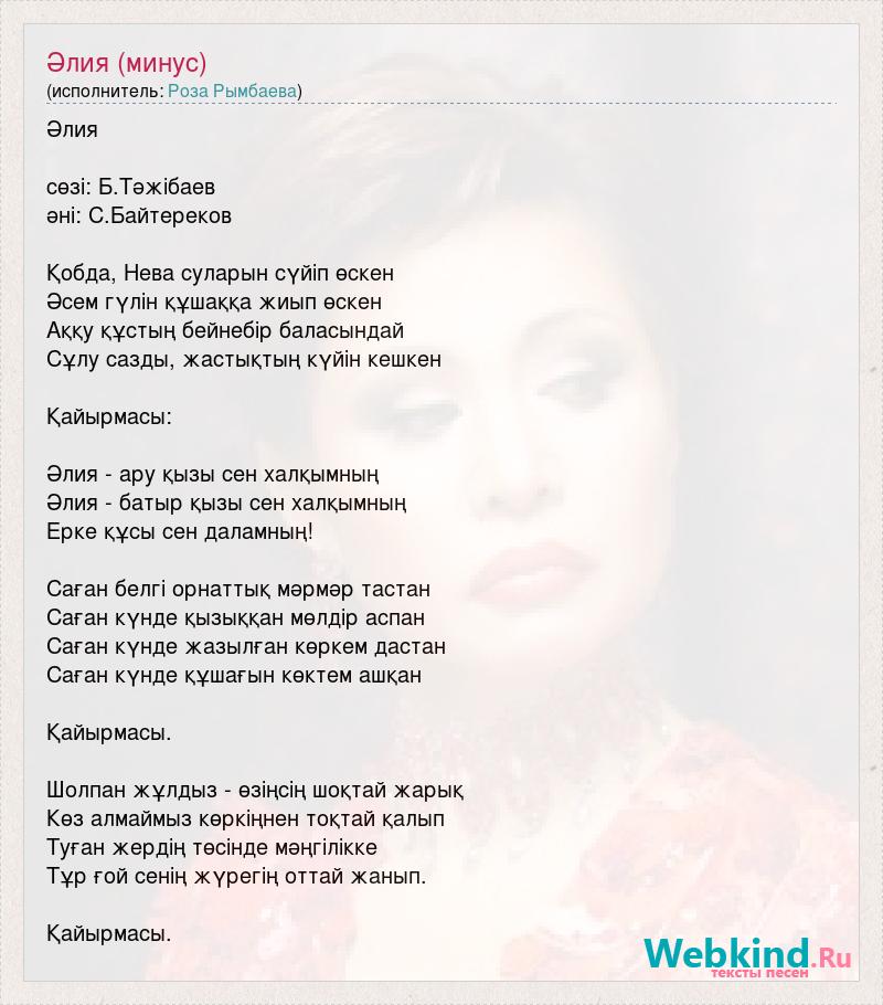 Әлия сөзі: Б.Тәжібаев әні: С.Байтереков Қобда, Нева суларын сүйіп өскен Әсем гүлін құшаққа жиып өскен Аққу құстың бейнебір баласындай Сұлу сазды, жастықтың күйін кешкен Қайырмасы: Әлия - ару қызы сен халқымның Әлия - батыр қызы сен халқымның Ерке құсы сен даламның! Саған белгі орнаттық мәрмәр тастан Саған күнде қызыққан мөлдір аспан Саған күнде жазылған көркем дастан Саған күнде құшағын көктем ашқан Қайырмасы. Шолпан жұлдыз - өзіңсің шоқтай жарық Көз алмаймыз көркіңнен тоқтай қалып Туған жердің төсінде мәңгілікке Тұр ғой сенің жүрегің оттай жанып. Қайырмасы.