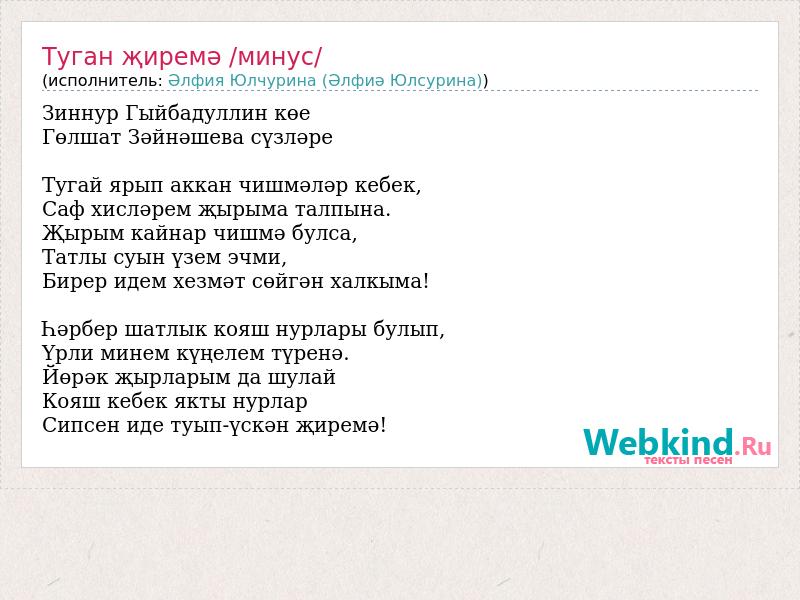 Зиннур Гыйбадуллин көе Гөлшат Зәйнәшева сүзләре Тугай ярып аккан чишмәләр кебек, Саф хисләрем җырыма талпына. Җырым кайнар чишмә булса, Татлы суын үзем эчми, Бирер идем хезмәт сөйгән халкыма! Һәрбер шатлык кояш нурлары булып, Үрли минем күңелем түренә. Йөрәк җырларым да шулай Кояш кебек якты нурлар Сипсен иде туып-үскән җиремә!