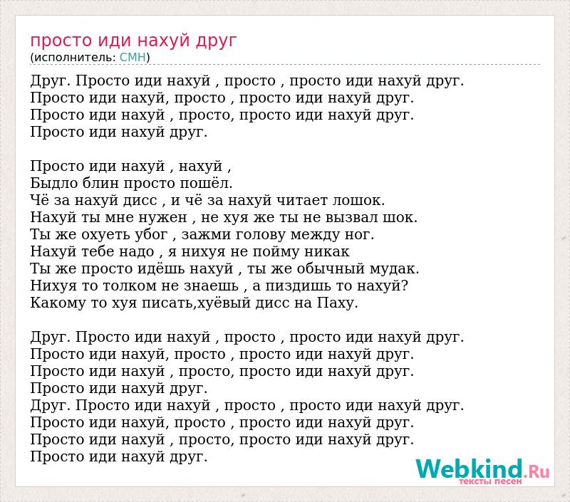 Друг. Просто иди нахуй , просто , просто иди нахуй друг. Просто иди нахуй, просто , просто иди нахуй друг. Просто иди нахуй , просто, просто иди нахуй друг. Просто иди нахуй друг. Просто иди нахуй , нахуй , Быдло блин просто пошёл. Чё за нахуй дисс , и чё за нахуй читает лошок. Нахуй ты мне нужен , не хуя же ты не вызвал шок. Ты же охуеть убог , зажми голову между ног. Нахуй тебе надо , я нихуя не пойму никак Ты же просто идёшь нахуй , ты же обычный мудак. Нихуя то толком не знаешь , а пиздишь то нахуй? Какому то хуя писать,хуёвый дисс на Паху. Друг. Просто иди нахуй , просто , просто иди нахуй друг. Просто иди нахуй, просто , просто иди нахуй друг. Просто иди нахуй , просто, просто иди нахуй друг. Просто иди нахуй друг. Друг. Просто иди нахуй , просто , просто иди нахуй друг. Просто иди нахуй, просто , просто иди нахуй друг. Просто иди нахуй , просто, просто иди нахуй друг. Просто иди нахуй друг.