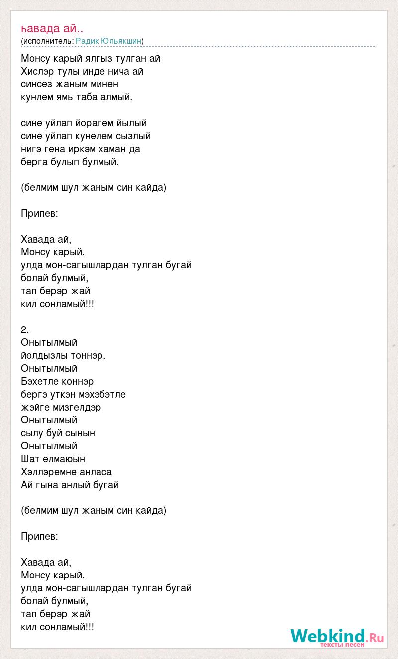Монсу карый ялгыз тулган ай Хислэр тулы инде нича ай синсез жаным минен кунлем ямь таба алмый. сине уйлап йорагем йылый сине уйлап кунелем сызлый нигэ гена иркэм хаман да берга булып булмый. (белмим шул жаным син кайда) Припев: Хавада ай, Монсу карый. улда мон-сагышлардан тулган бугай болай булмый, тап берэр жай кил сонламый!!! 2. Онытылмый йолдызлы тоннэр. Онытылмый Бэхетле коннэр бергэ уткэн мэхэбэтле жэйге мизгелдэр Онытылмый сылу буй сынын Онытылмый Шат елмаюын Хэллэремне анласа Ай гына анлый бугай (белмим шул жаным син кайда) Припев: Хавада ай, Монсу карый. улда мон-сагышлардан тулган бугай болай булмый, тап берэр жай кил сонламый!!!