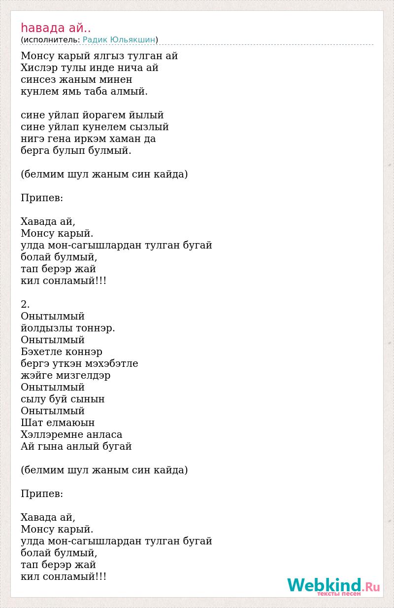 Монсу карый ялгыз тулган ай Хислэр тулы инде нича ай синсез жаным минен кунлем ямь таба алмый. сине уйлап йорагем йылый сине уйлап кунелем сызлый нигэ гена иркэм хаман да берга булып булмый. (белмим шул жаным син кайда) Припев: Хавада ай, Монсу карый. улда мон-сагышлардан тулган бугай болай булмый, тап берэр жай кил сонламый!!! 2. Онытылмый йолдызлы тоннэр. Онытылмый Бэхетле коннэр бергэ уткэн мэхэбэтле жэйге мизгелдэр Онытылмый сылу буй сынын Онытылмый Шат елмаюын Хэллэремне анласа Ай гына анлый бугай (белмим шул жаным син кайда) Припев: Хавада ай, Монсу карый. улда мон-сагышлардан тулган бугай болай булмый, тап берэр жай кил сонламый!!!
