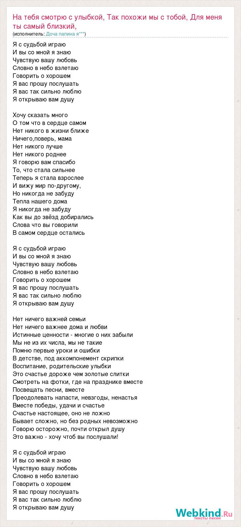 Я с судьбой играю И вы со мной я знаю Чувствую вашу любовь Словно в небо взлетаю Говорить о хорошем Я вас прошу послушать Я вас так сильно люблю Я открываю вам душу Хочу сказать много О том что в сердце самом Нет никого в жизни ближе Ничего,поверь, мама Нет никого лучше Нет никого роднее Я говорю вам спасибо То, что стала сильнее Теперь я стала взрослее И вижу мир по-другому, Но никогда не забуду Тепла нашего дома Я никогда не забуду Как вы до звёзд добирались Слова что вы говорили В самом сердце остались Я с судьбой играю И вы со мной я знаю Чувствую вашу любовь Словно в небо взлетаю Говорить о хорошем Я вас прошу послушать Я вас так сильно люблю Я открываю вам душу Нет ничего важней семьи Нет ничего важнее дома и любви Истинные ценности - многие о них забыли Мы не из их числа, мы не такие Помню первые уроки и ошибки В детстве, под аккомпонемент скрипки Воспитание, родительские улыбки Это счастье дороже чем золотые слитки Смотреть на фотки, где на празднике вместе Посвещать песни, вместе Преодолевать напасти, невзгоды, ненастья Вместе победы, удачи и счастье Счастье настоящее, оно не ложно Бывает сложно, но без родных невозможно Говорю осторожно, почти открыл душу Это важно - хочу чтоб вы послушали! Я с судьбой играю И вы со мной я знаю Чувствую вашу любовь Словно в небо взлетаю Говорить о хорошем Я вас прошу послушать Я вас так сильно люблю Я открываю вам душу