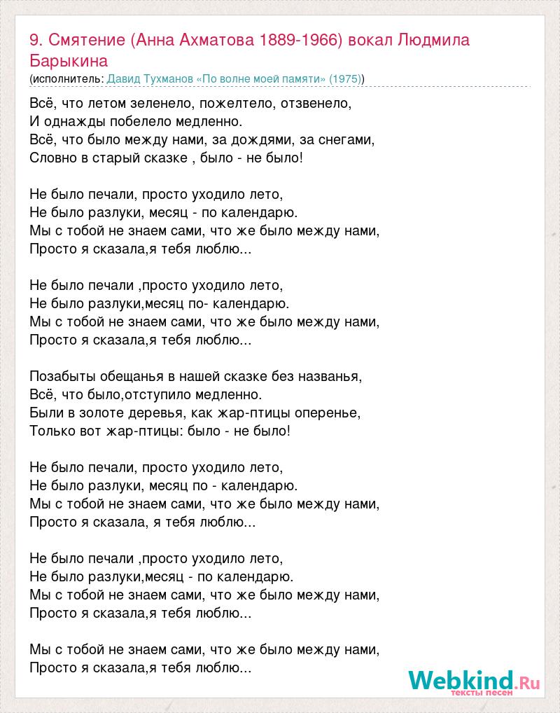 А как ты думаешь, о чем песня "9. Смятение (Анна Ахматова 1889-1966) вокал Людмила Барыкина" ?