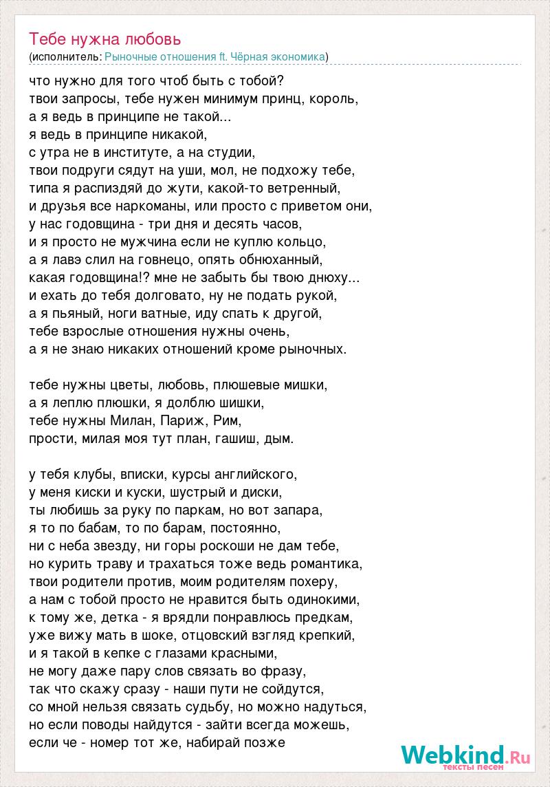 что нужно для того чтоб быть с тобой? твои запросы, тебе нужен минимум принц, король, а я ведь в принципе не такой... я ведь в принципе никакой, с утра не в институте, а на студии, твои подруги сядут на уши, мол, не подхожу тебе, типа я распиздяй до жути, какой-то ветренный, и друзья все наркоманы, или просто с приветом они, у нас годовщина - три дня и десять часов, и я просто не мужчина если не куплю кольцо, а я лавэ слил на говнецо, опять обнюханный, какая годовщина!? мне не забыть бы твою днюху... и ехать до тебя долговато, ну не подать рукой, а я пьяный, ноги ватные, иду спать к другой, тебе взрослые отношения нужны очень, а я не знаю никаких отношений кроме рыночных. тебе нужны цветы, любовь, плюшевые мишки, а я леплю плюшки, я долблю шишки, тебе нужны Милан, Париж, Рим, прости, милая моя тут план, гашиш, дым. у тебя клубы, вписки, курсы английского, у меня киски и куски, шустрый и диски, ты любишь за руку по паркам, но вот запара, я то по бабам, то по барам, постоянно, ни с неба звезду, ни горы роскоши не дам тебе, но курить траву и трахаться тоже ведь романтика, твои родители против, моим родителям похеру, а нам с тобой просто не нравится быть одинокими, к тому же, детка - я врядли понравлюсь предкам, уже вижу мать в шоке, отцовский взгляд крепкий, и я такой в кепке с глазами красными, не могу даже пару слов связать во фразу, так что скажу сразу - наши пути не сойдутся, со мной нельзя связать судьбу, но можно надуться, но если поводы найдутся - зайти всегда можешь, если че - номер тот же, набирай позже