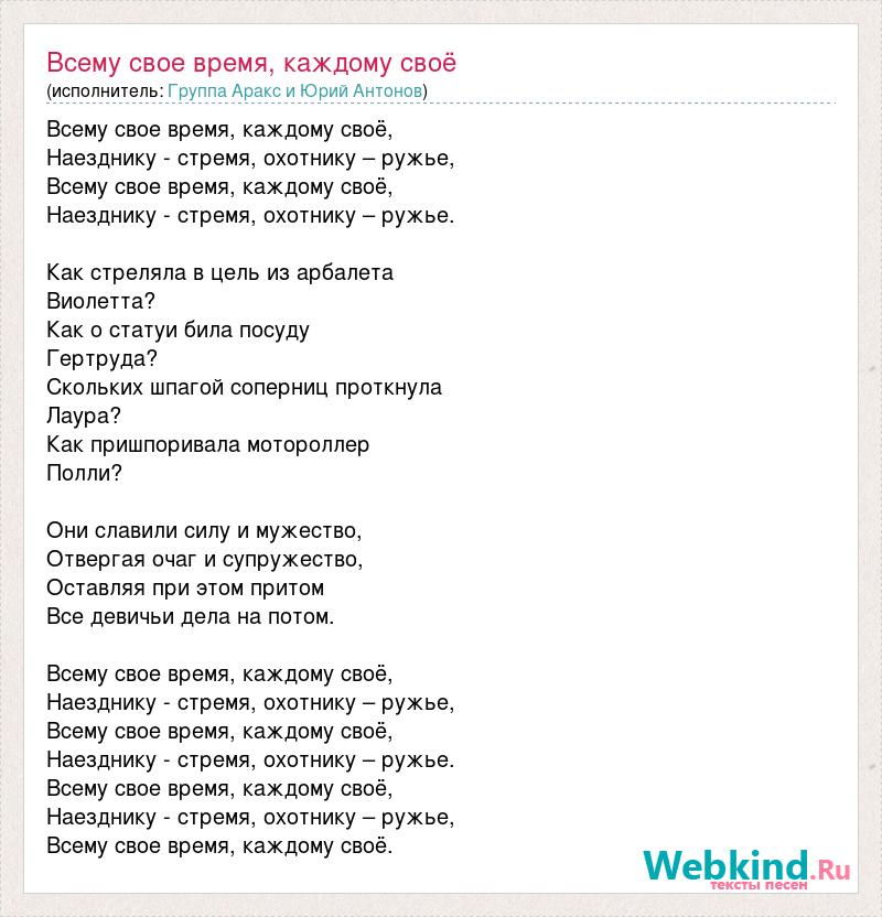 Всему свое время, каждому своё, Наезднику - стремя, охотнику – ружье, Всему свое время, каждому своё, Наезднику - стремя, охотнику – ружье. Как стреляла в цель из арбалета Виолетта? Как о статуи била посуду Гертруда? Скольких шпагой соперниц проткнула Лаура? Как пришпоривала мотороллер Полли? Они славили силу и мужество, Отвергая очаг и супружество, Оставляя при этом притом Все девичьи дела на потом. Всему свое время, каждому своё, Наезднику - стремя, охотнику – ружье, Всему свое время, каждому своё, Наезднику - стремя, охотнику – ружье. Всему свое время, каждому своё, Наезднику - стремя, охотнику – ружье, Всему свое время, каждому своё.