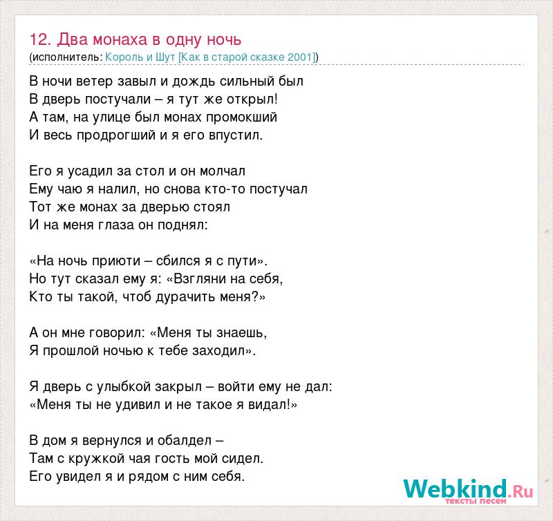 В ночи ветер завыл и дождь сильный был В дверь постучали – я тут же открыл! А там, на улице был монах промокший И весь продрогший и я его впустил. Его я усадил за стол и он молчал Ему чаю я налил, но снова кто-то постучал Тот же монах за дверью стоял И на меня глаза он поднял: «На ночь приюти – сбился я с пути». Но тут сказал ему я: «Взгляни на себя, Кто ты такой, чтоб дурачить меня?» А он мне говорил: «Меня ты знаешь, Я прошлой ночью к тебе заходил». Я дверь с улыбкой закрыл – войти ему не дал: «Меня ты не удивил и не такое я видал!» В дом я вернулся и обалдел – Там с кружкой чая гость мой сидел. Его увидел я и рядом с ним себя.